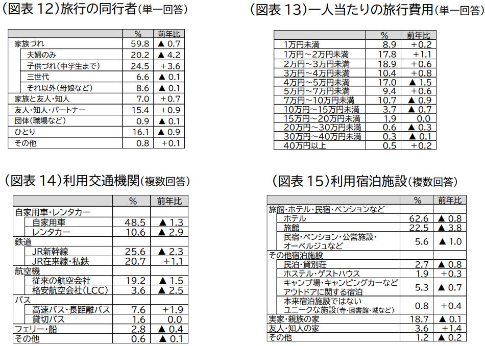 同行者:「子供づれ(中学生まで)の家族旅行(24.5%)」が最も多く、前年から3.6ポイント増加しました。次いで「夫婦のみ(20.2%)」となりましたが、前年より4.2ポイント減少しています。また「友人・知人・パートナー(15.4%)」が0.9ポイント増加、「家族と友人・知人(7.0%)」が0.7ポイント増加するなど、新型コロナが5類に移行した直後であった前年に比べ、より大人数で家族以外の親しい人との旅行が増えている様子がうかがえます(図表12)。
