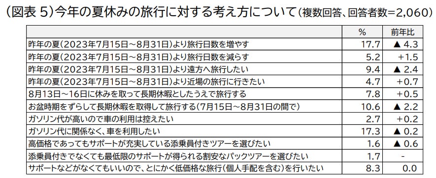 次に、夏休みに旅行へ行くと答えた本調査対象者2,060人に対して、今年の夏休みの旅行に対する考え方を聞きました。「昨年の夏休みより旅行日数を増やす」は17.7%で、「昨年の夏休みより旅行日数を減らす(5.2%)」を大きく上回りましたが、前年に比べると前者は減少、後者は増加となっており、日数は短くなる傾向がみられます。また、「昨年の夏休みより遠方へ旅行したい(9.4%)」は「昨年の夏休みより近場の旅行に行きたい(4.7%)」を4.7ポイント上回るものの、前年と比較すると前者は減少、後者は増加しているため、旅行先は比較的近距離となる傾向がうかがえます。旅行費用に関連する項目では、「ガソリン代に関係なく、車を利用したい(17.3%)」が「ガソリン代が高いので車の利用は控えたい(2.7%)」を大きく上回る一方で、旅行のサポートについては、サポート付の旅行を希望する声より、サポートがなくても低価格な旅行を希望する声が多い結果となりました(図表5)。