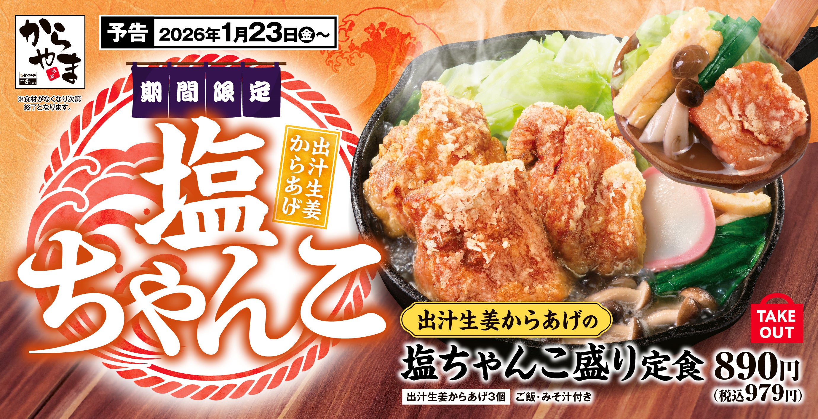 とんかつ専⾨店「かつや」などを展開するアークランドサービスホールディングス株式会社の⼦会社、エバーアクション株式会社(本社:東京都千代⽥区/代表:渡部 貴)は、2026年1⽉23⽇(金)より国内の「からやま」にて「出汁生姜からあげの塩ちゃんこ盛り定食」を期間限定で販売開始いたします。
