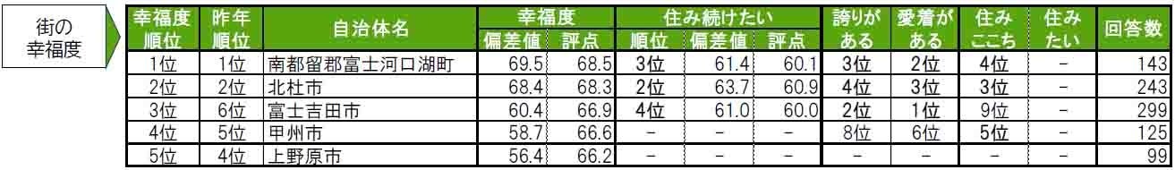 街の幸福度1位は4年連続で南都留郡富士河口湖町。2位は3年連続で北杜市。3位富士吉田市。