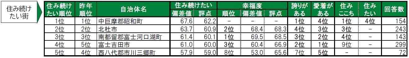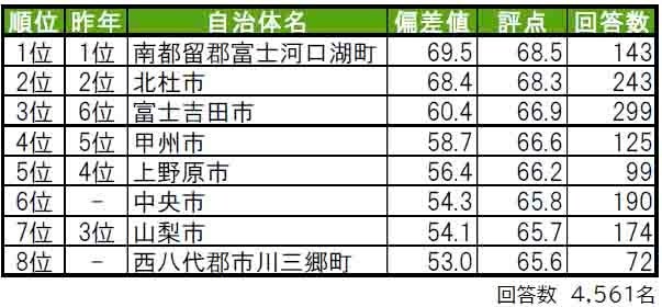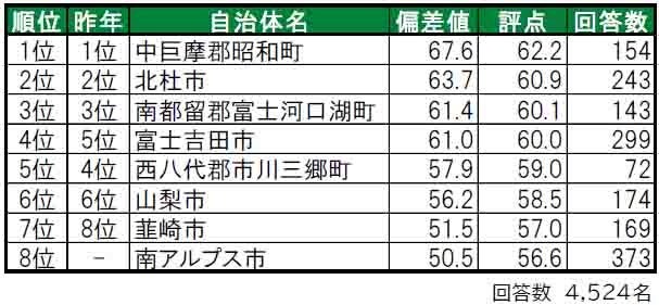 1位は、4年連続で中巨摩郡昭和町です。2位は北杜市、3位は南都留郡富士河口湖町で、いずれも2年連続でのランクインです。その他、昨年は偏差値50未満だったため順位非公表だった南アルプス市が8位にランクインしています。