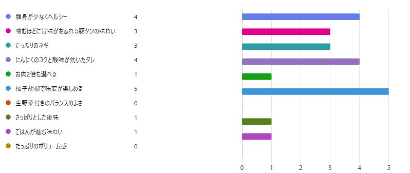 最も多くの票を集めたのは「柚子胡椒で味変が楽しめる」というポイントでした。続いて「脂身が少なくヘルシー」、「にんにくのコクと酸味が効いたタレ」が同率2位という結果になりました。