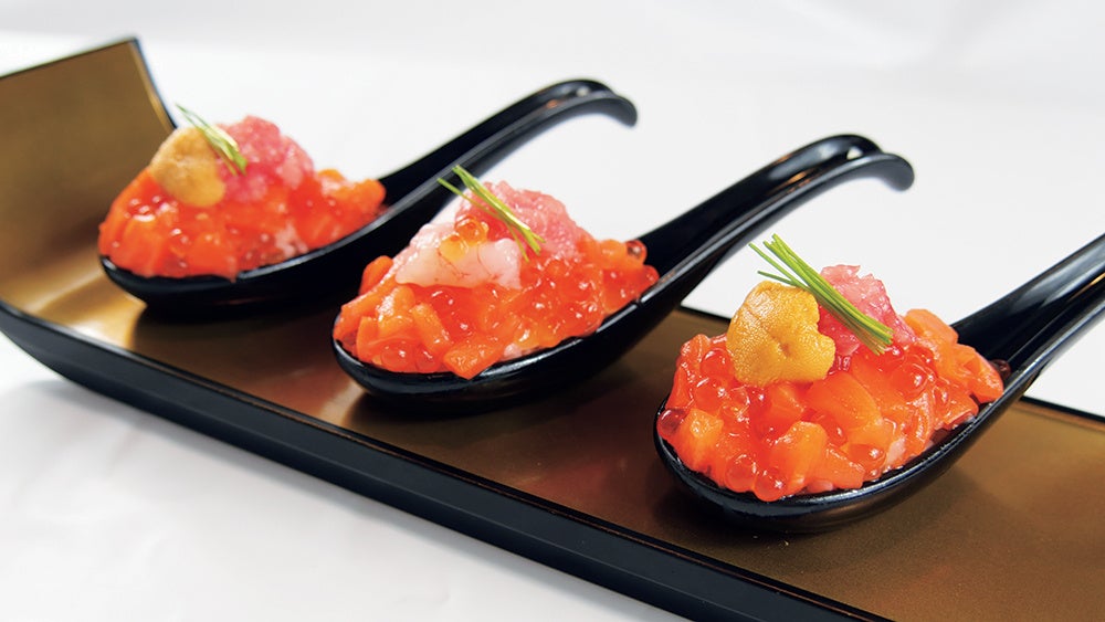 色鮮やかな「大雪サーモン」を敷き詰め、最後にほたてをトッピング!「大雪山の雪どけ」をイメージしました。