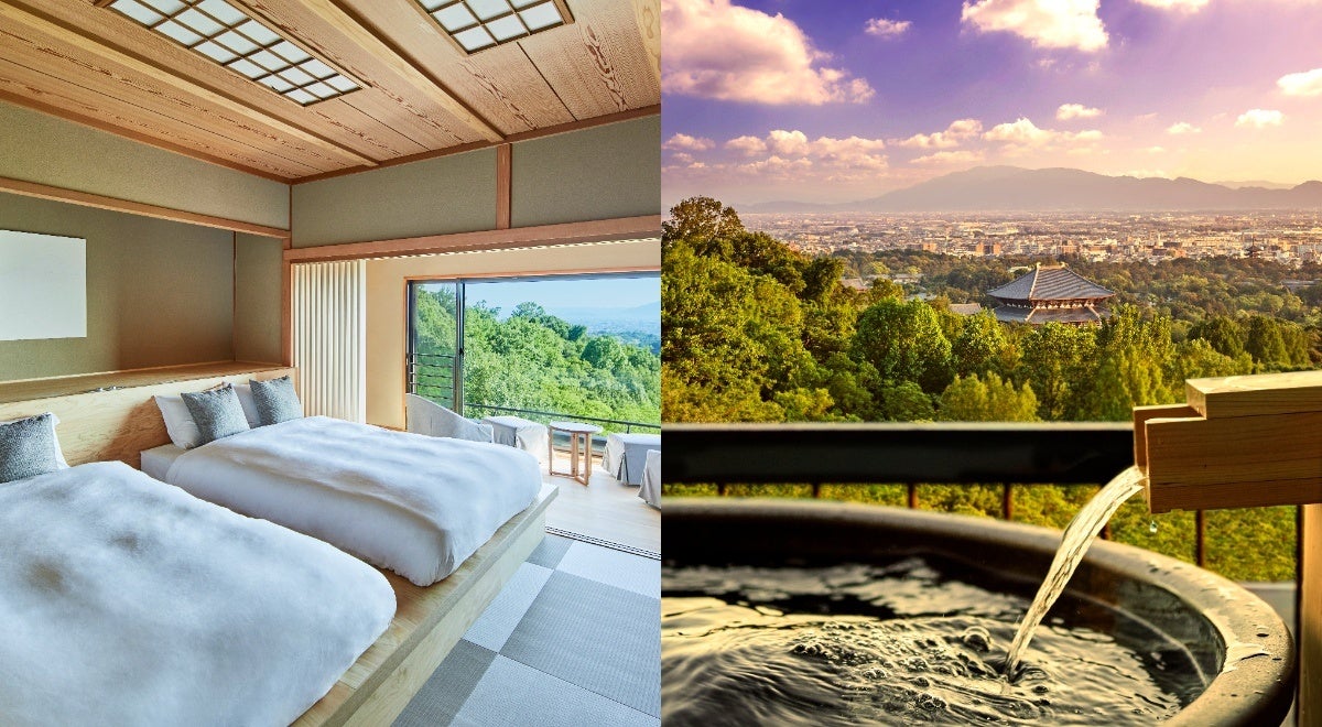 若草山中腹に位置する「和食オーベルジュ」。東大寺大仏殿や興福寺五重塔といった世界遺産、奈良公園の豊かな自然、時間と共に様々な表情を見せる奈良市街のパノラマビューが自慢のお宿です。それらの景色を堪能できる屋上露天風呂や、奈良の食材をふんだんに使ったお食事、奈良の文化を体感できる体験プログラム、人の温度が伝わるおもてなしで、日々のあわただしさや都会の喧騒を忘れてほっとひと息つけるような時間を提供します。