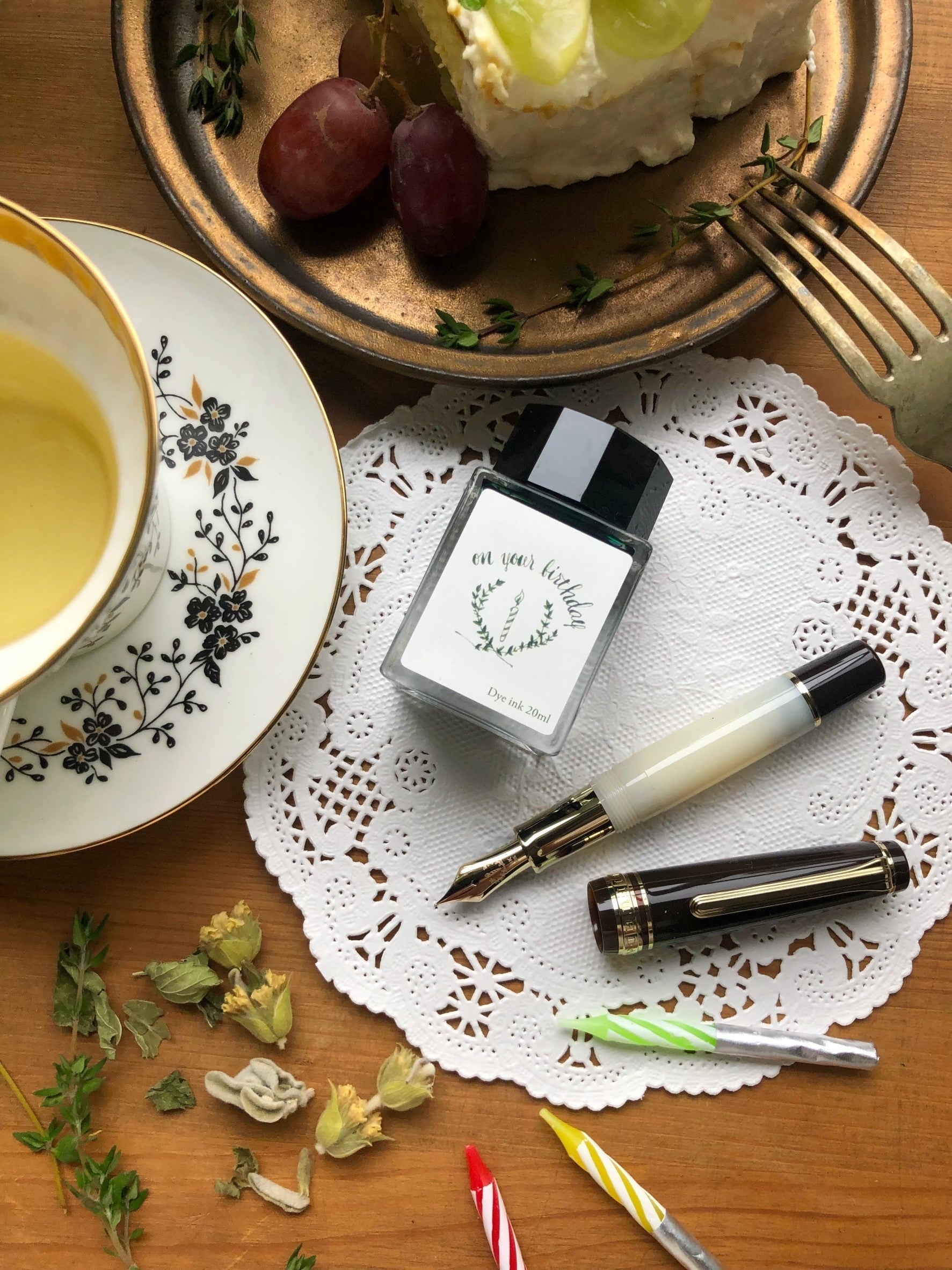万年筆と同時発売のインクはバースデーケーキと共に楽しむハーブティーをイメージした落ち着きのあるグリーンです。万年筆のペン先の刻印とお揃いのボトルラベルにも注目です。