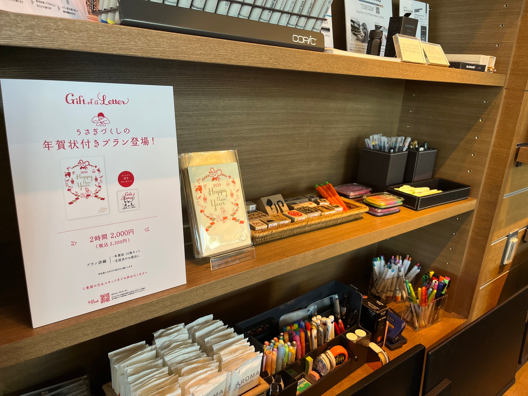 年賀状10枚セットがついた2時間2,000円(税込2,200円)の特別プランをご用意しました。ゆっくりとシェアラウンジでの時間を過ごしながら、大切な方へ手紙を書いてみるのはいかがでしょうか?