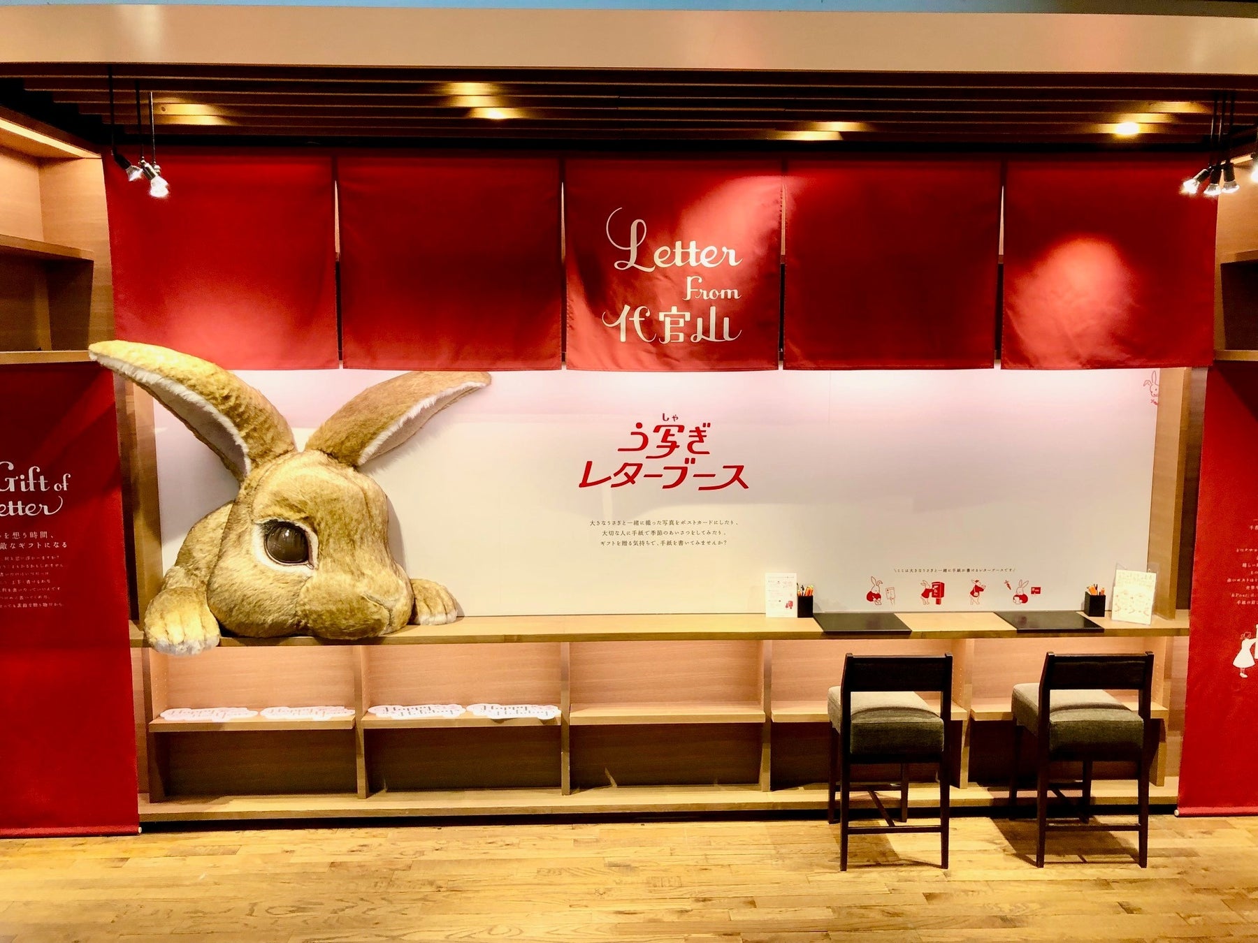 2号館1階 建築デザイン側ギャラリーにて、ライティングスペースをご用意しております。大きなうさぎと写真撮影ができる「う写ぎレターブース」も併設しております。週末にはうさぎと一緒に撮った写真をポストカードにして、年賀状として出せるイベントも開催予定です。