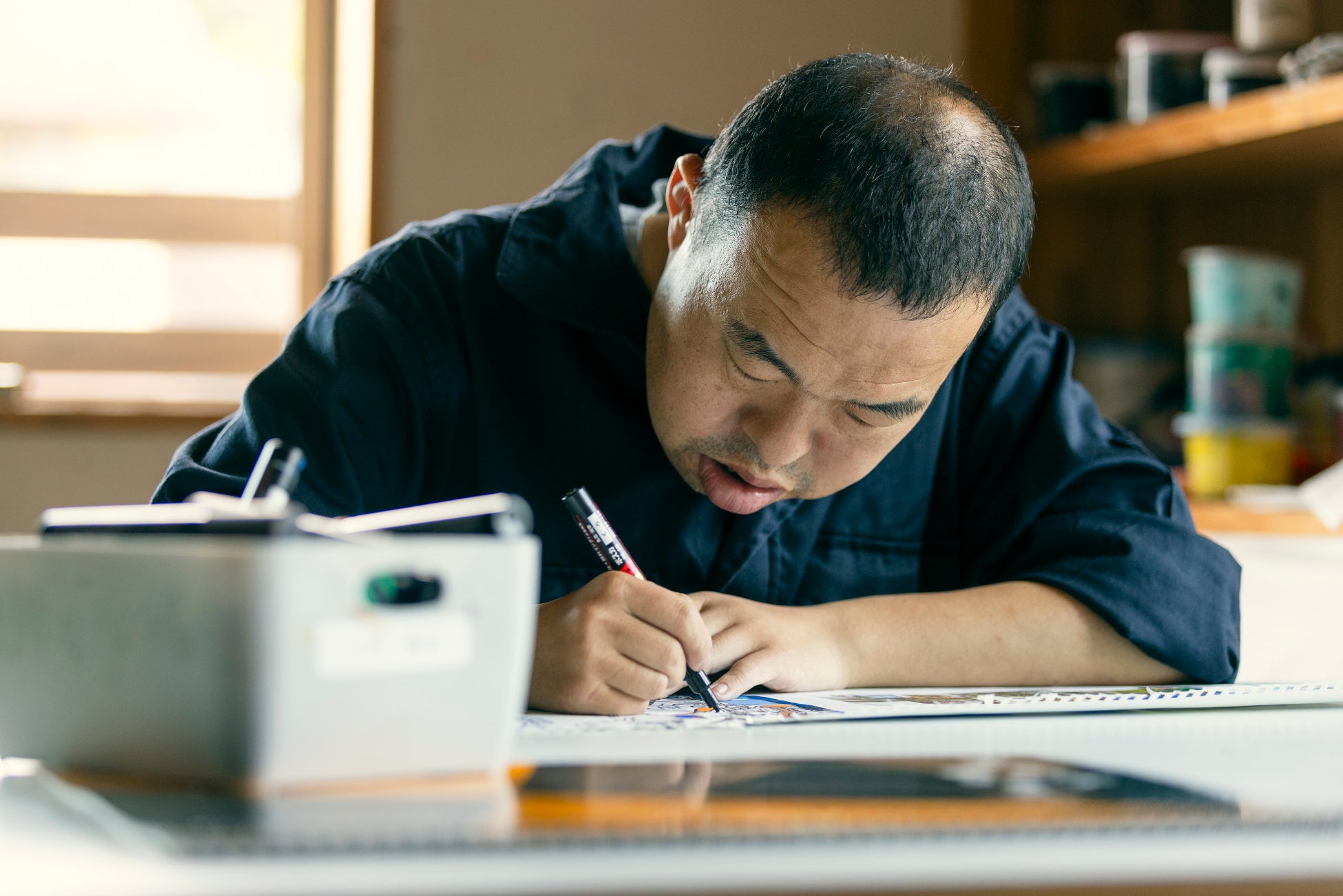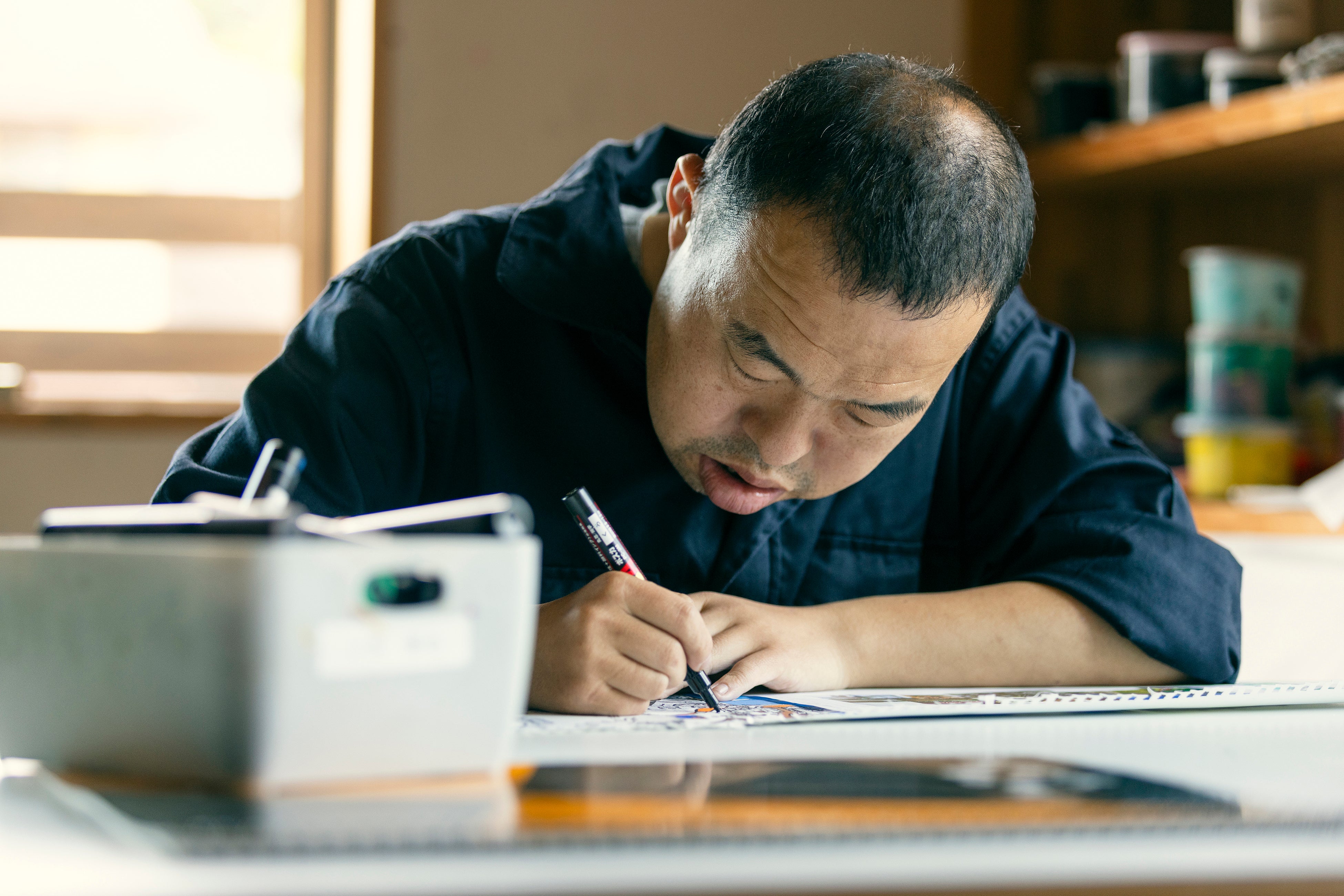 1983年生まれ、仙台市在住。2011 年に多夢多夢舎所属。2012年、多夢多夢舎での作業中に、ペンを使った細やかな筆致で、家具や文房具などの日常にあるものを「ロボット」にして描き始める。その後、写真を見ながら描くことが多くなり、「ロボット」よりもイラストや似顔絵を描くのが好きになった。ただし、気分が乗らないときはおしゃべりしかしない。