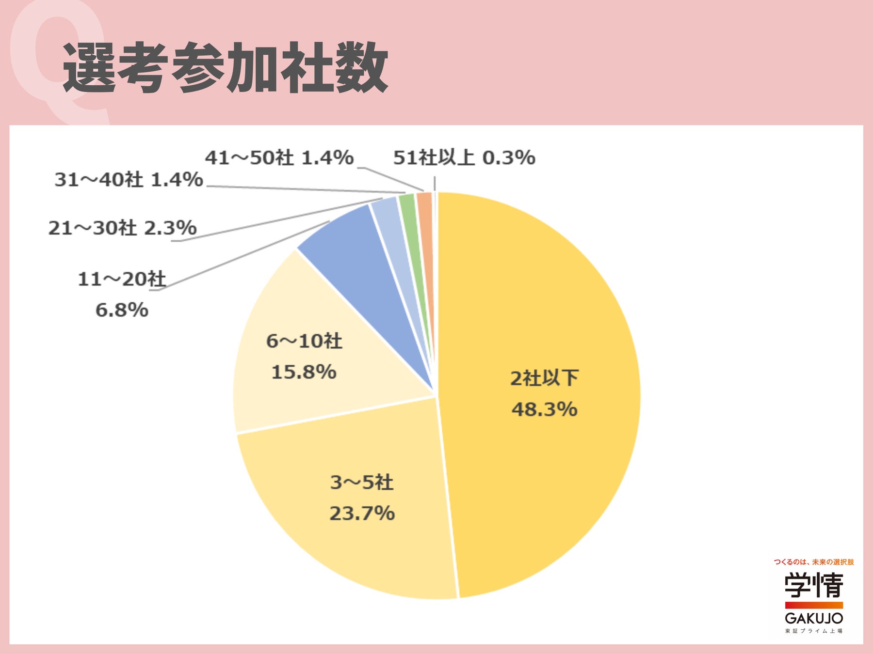 セミナー参加社数について、「2社以下」と回答した学生が、48.3%で最多となりました。「3~5社」23.7%、「6~10社」15.8%と続き、「10社以下」と回答した学生は9割に迫ります。「プレエントリーやセミナー参加が少ないので、必然的に選考参加も少なくなる」「内定を得たら実際に入社したい企業に絞って選考に参加している」「1社1社丁寧に選考を受けたい」「内定を得るためにはある程度の選考参加社数が必要だと思う」といった声が寄せられています。