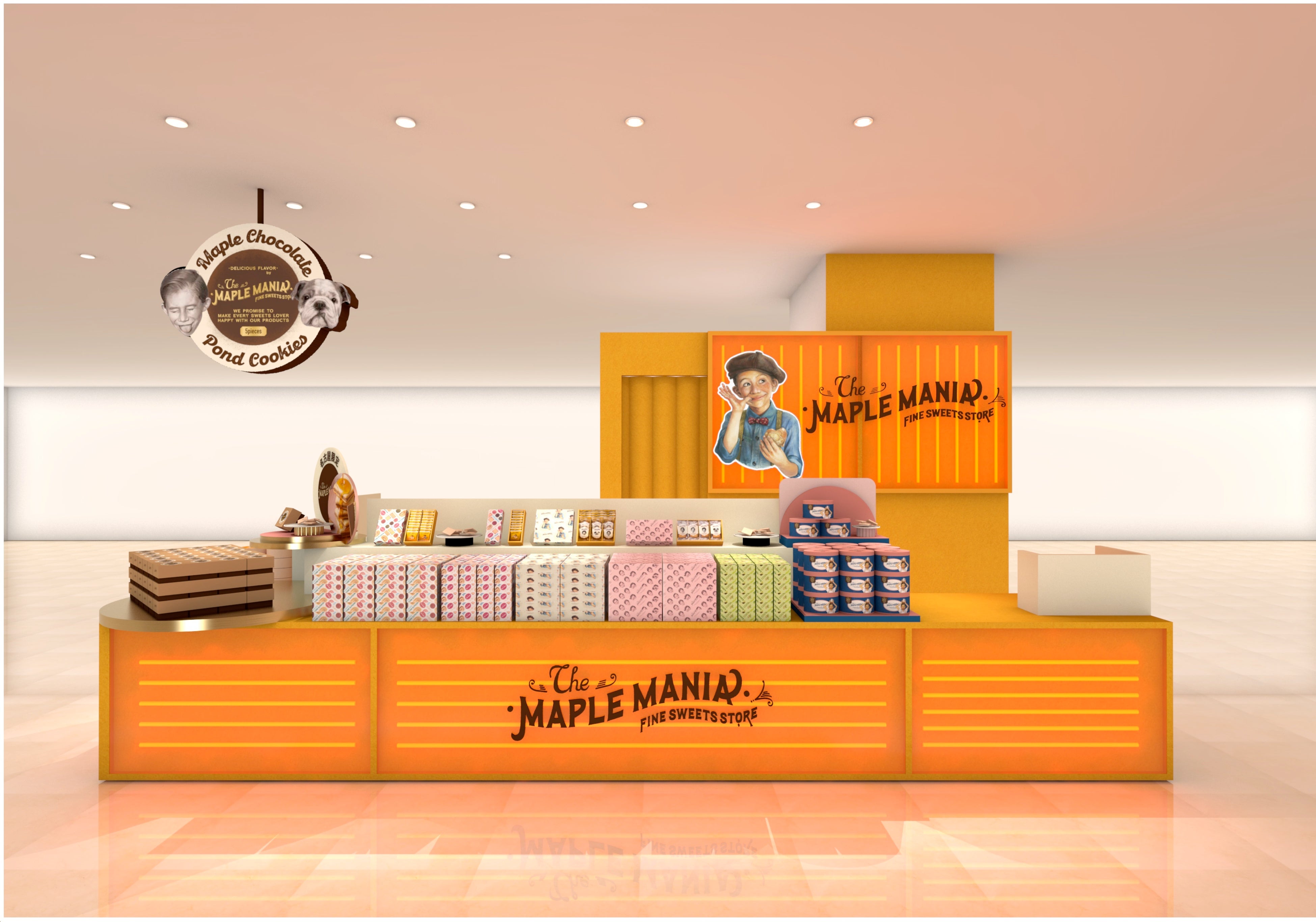 皆さまをお迎えする店舗は、パッと明るく目を引き、一目見ただけでワクワクするような「ザ・メープルマニア」の世界観を最大限に表現いたしました。2025アムール・デュ・ショコラの為にご用意した「メープルチョコポンドクッキー」がひときわ目立つように、坊やと愛犬のバディが寄り添う愛らしい姿も要チェックです!ぜひお立ち寄りくださいませ。