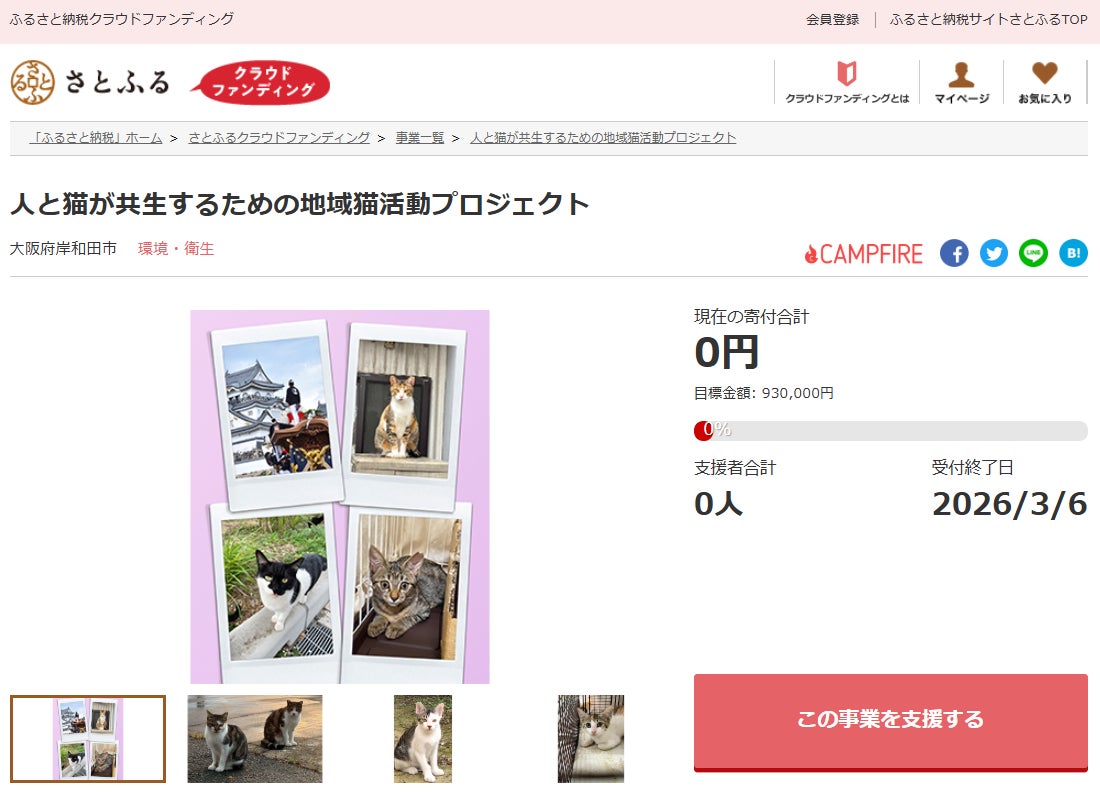 大阪府岸和田市とふるさと納税ポータルサイト「さとふる」を運営する株式会社さとふる(本社:東京都中央区、代表取締役社長 兼 CEO:藤井 宏明)は、「さとふるクラウドファンディング」にて、「人と猫が共生するための地域猫活動プロジェクト」の寄付受け付けを2025年12月8日より開始します。