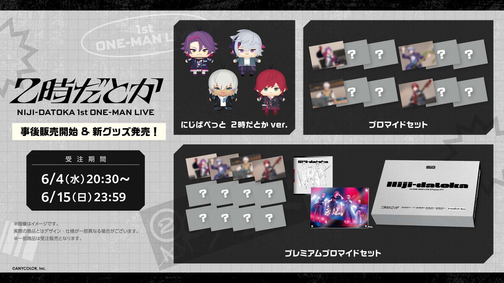 新たに「2時だとかver.」のにじぱぺっと(全4種)が登場!また、「2時だとか 1st ワンマンライブ」ライブシーン&練習時のオフショットを収録したブロマイドセット、ならびにプレミアムブロマイドセットも。
