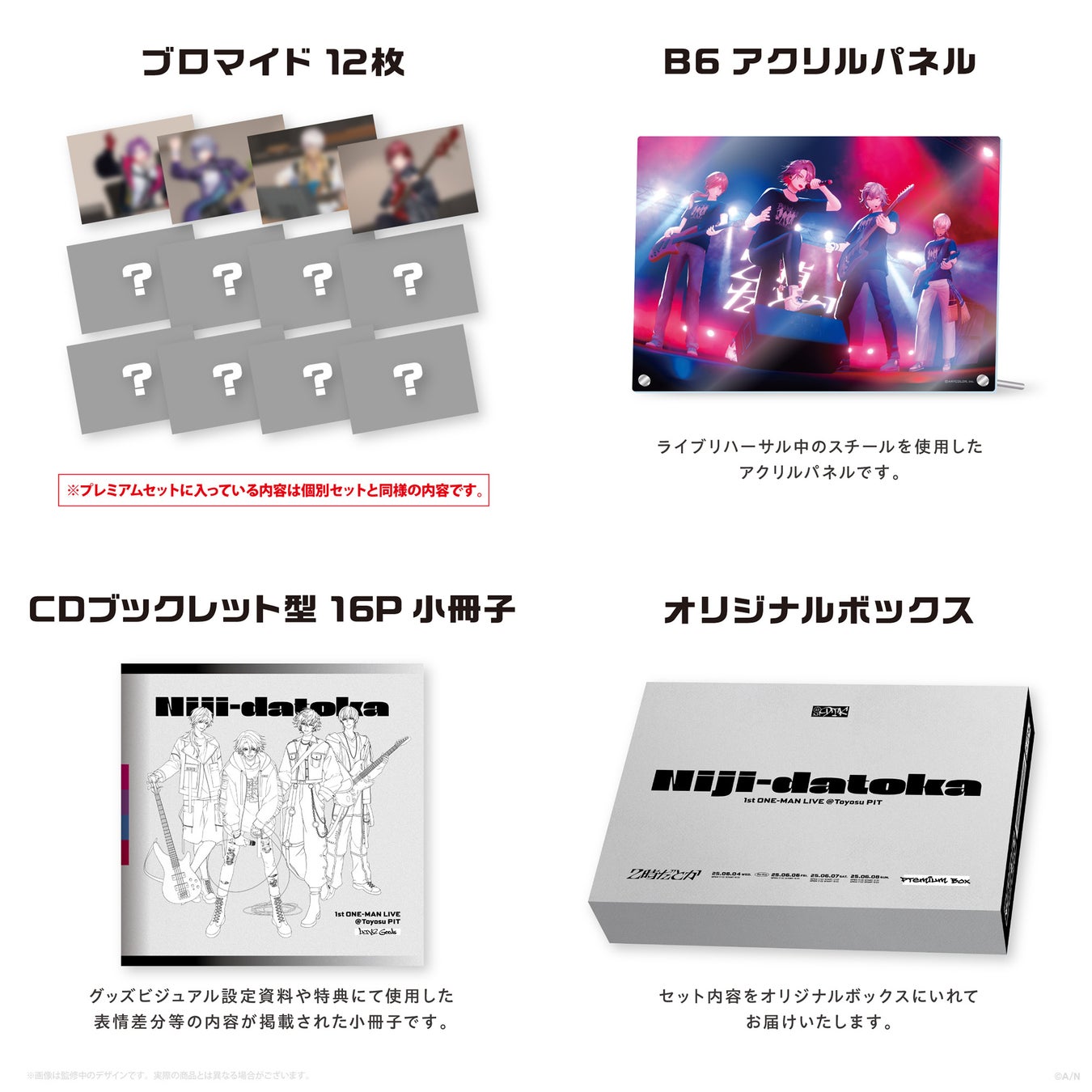 ブロマイド3枚セット×4種(全12枚)、ライブリハーサル中のスチールを使用したB6サイズのアクリルパネル、グッズビジュアル設定資料や特典にて使用した表情差分等の内容が掲載されたCDブックレット型16P小冊子をオリジナルボックスでお届けするプレミアムセットです。