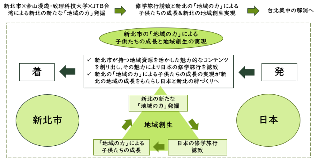 以上の背景から、台湾でDMCの役割を持つJTB台湾が、全国47都道府県にあるJTBの支店で取り扱う教育旅行の現場から生まれる声をダイレクトに聞き入れ、新北市を舞台に体験プログラムの開発・運営を行います。JTB台湾が新北市と連携し、持続可能な社会の実現に向けた課題解決力を身につけるためのプログラムを創り、地域の魅力を体験できる機会を提供することで、日本の学生の成長と新北市の地域創生に寄与してまいります。