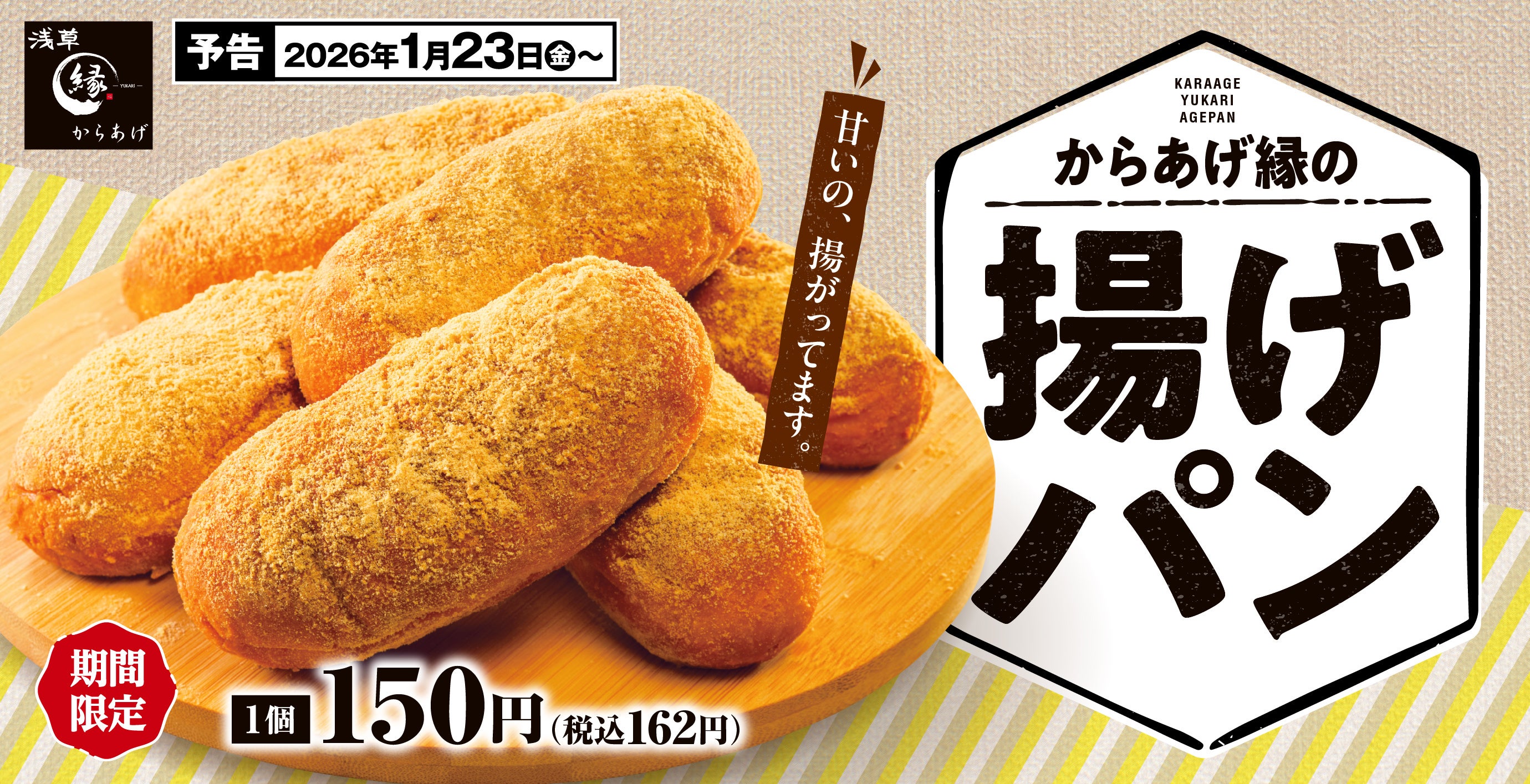 とんかつ専⾨店「かつや」などを展開するアークランドサービスホールディングス株式会社の⼦会社、エバーアクション株式会社(本社:東京都千代⽥区/代表:渡部 貴)は、2026年1月23日(金)より国内の「からあげ縁-YUKARI-」にて「揚げパン」を期間限定で販売開始いたします。