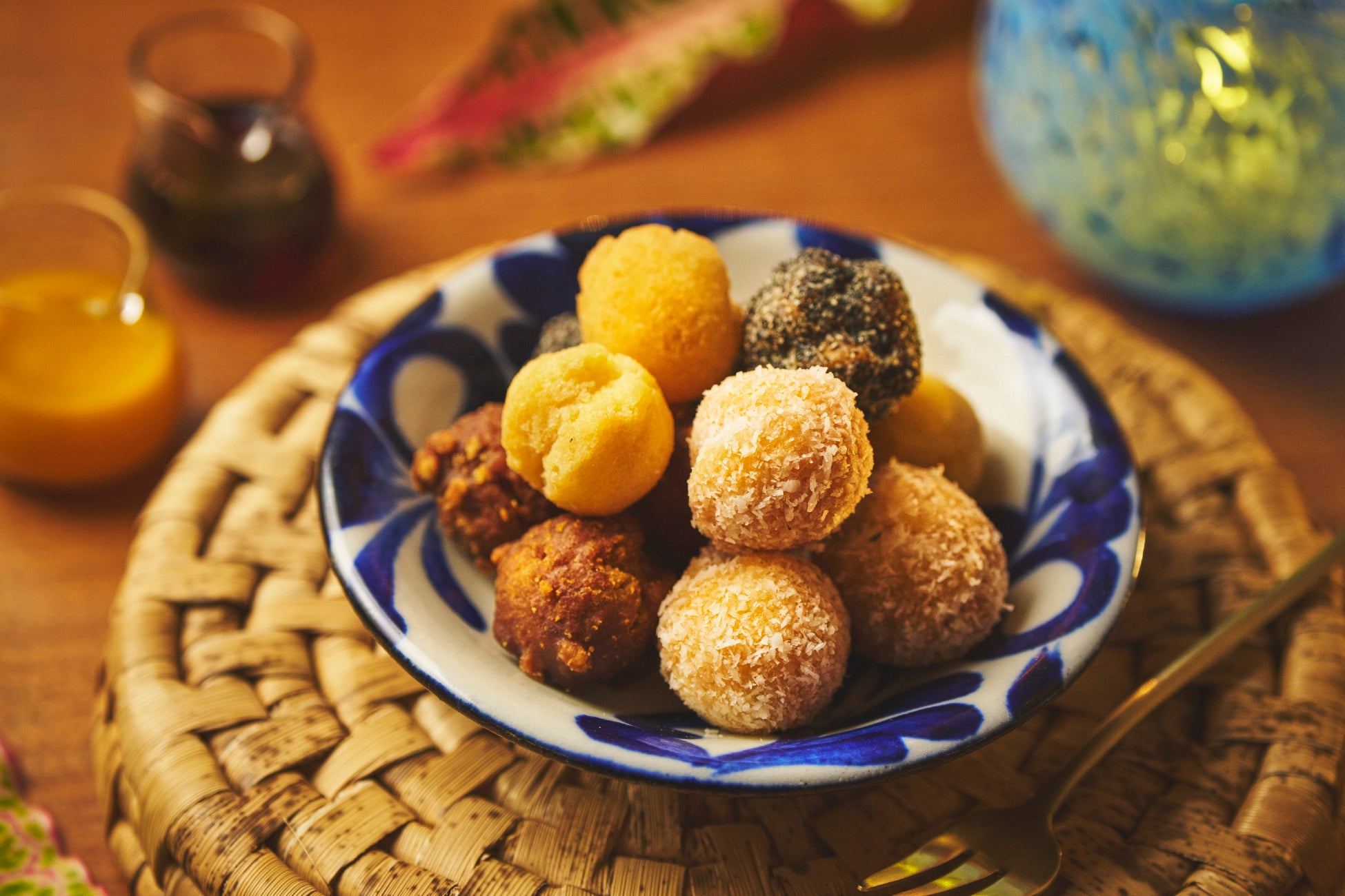 形がお花が開いたように見えることから、お祝いの席でも食べられる沖縄の郷土菓子の一つサーターアンダギーを、一口サイズで提供します。味は、王道のプレーン味に、黒糖、ココナッツなど南国らしいラインナップを加えた5種。自分好みを選び、そのまま味わうのはもちろん、お好みでマンゴーソースや黒蜜をつけてアレンジをすることもできます。夜の宴を盛り上げる新メニューです。