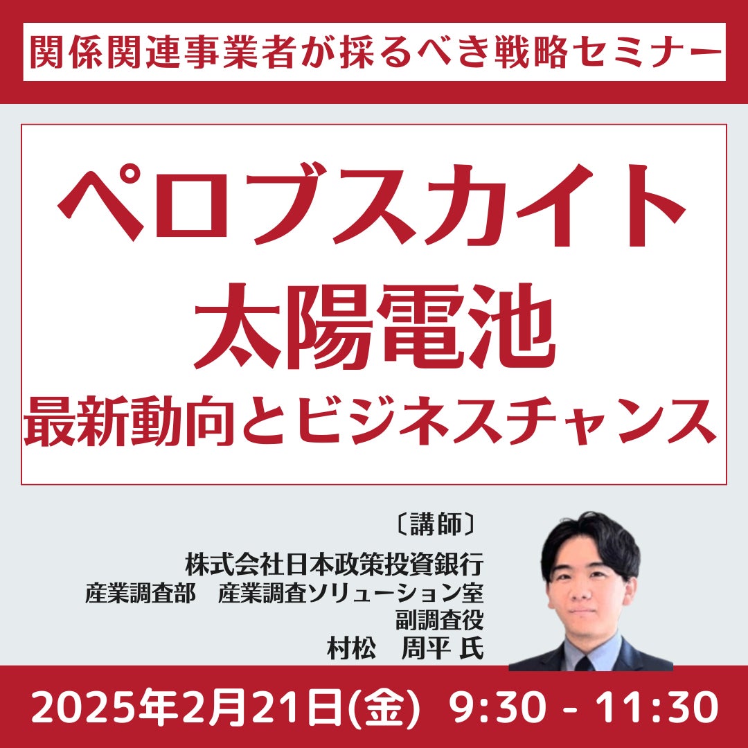 JPI(日本計画研究所)は、株式会社日本政策投資銀行 産業調査部 産業調査ソリューション室 副調査役 村松 周平 氏を招聘し、ペロブスカイト太陽電池をめぐる最新動向とビジネスチャンスについて詳説いただくセミナーを開催します。