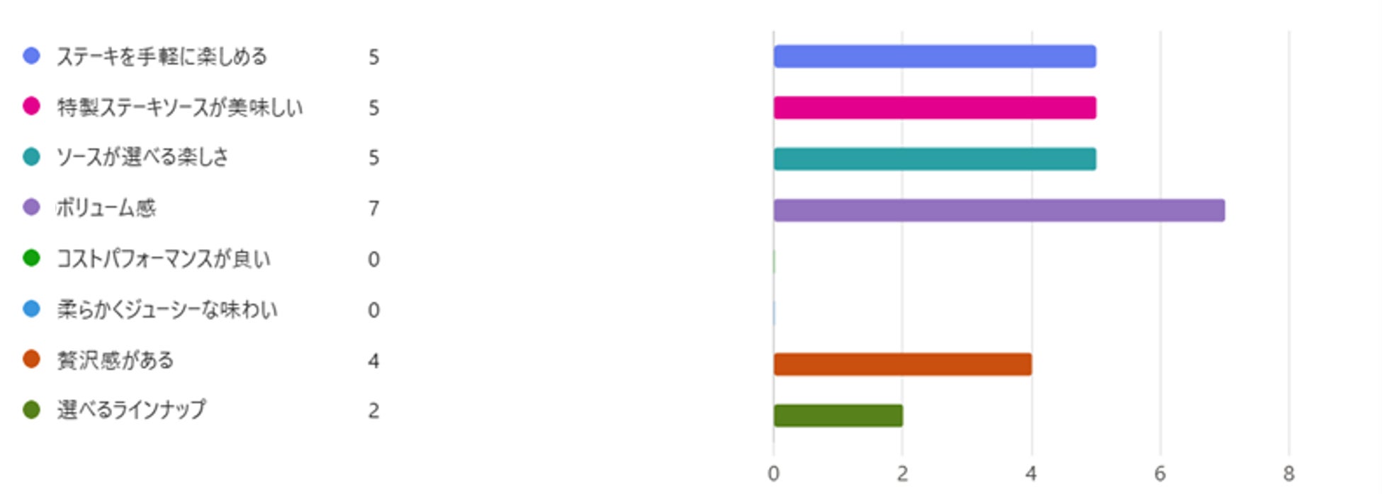 最も多くの票を集めたのは『ボリューム感』というポイントでした。同率2位は『ステーキを手軽に楽しめる』、『特製ステーキソースが美味しい』、『ソースが選べる楽しさ』でした。