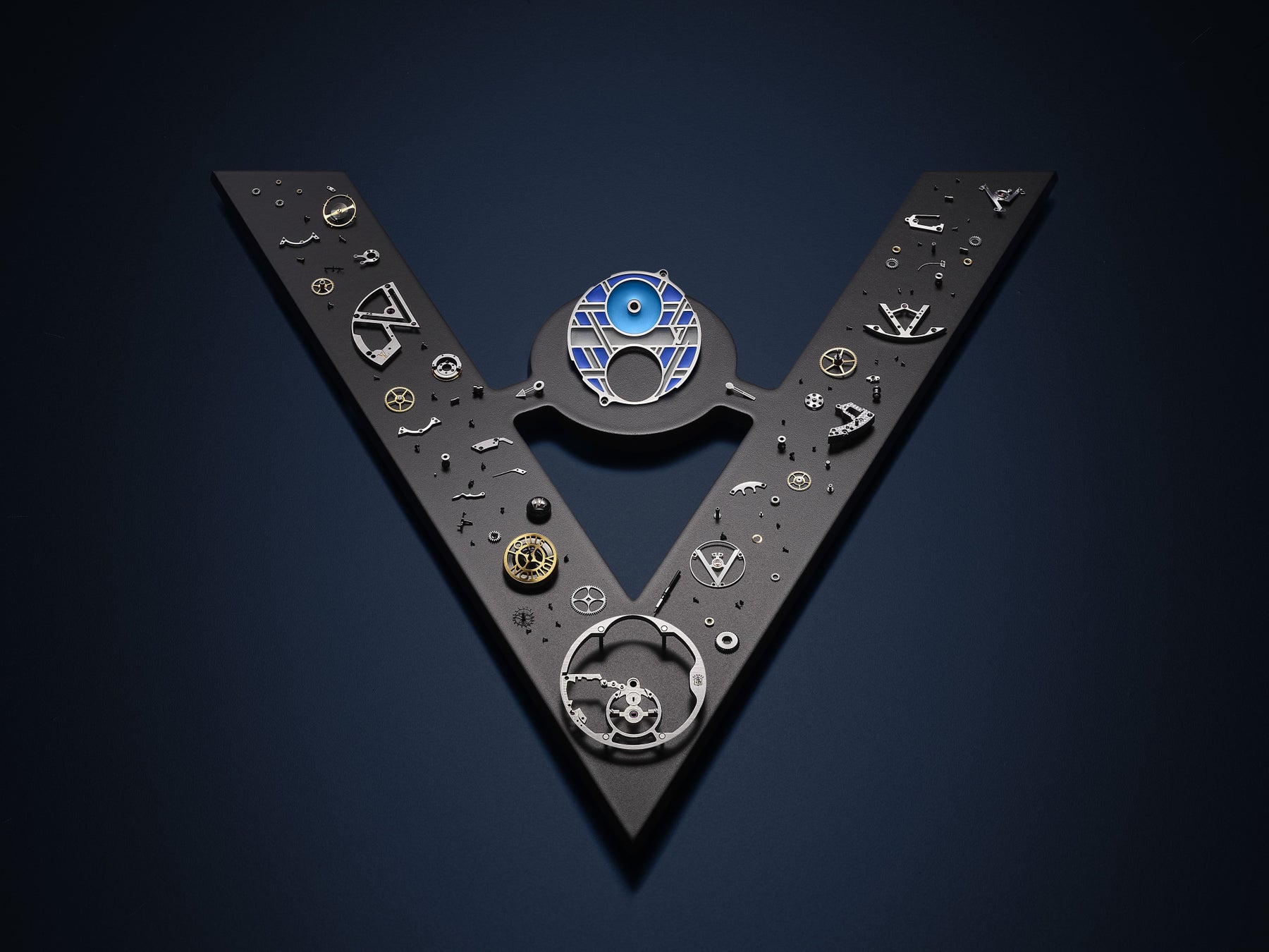 大文字の「V」を象ったアイコニックな調速機のキャリッジは、1分間に1回転します。「V」モチーフの躍動感は、垂直に配置されたムーブメントやダイアルのプリカジュールのモチーフと相まって、このトゥールビヨンに真にユニークな個性をもたらします。