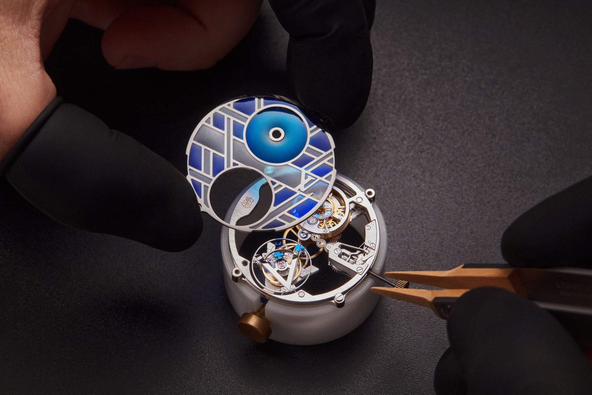 このブルーのグラデーションを表現するためには、何ヶ月にもわたる研究が必要でした。これを実現すべく、メゾンは「ラ・ファブリク・デ・アール」のアトリエに携わる数名の熟練したエナメル職人と協業。「ヴォヤジャー フライング トゥールビヨン ポワンソン・ド・ジュネーヴ プリカジュール」のダイアルはすべて「ラ・ファブリク・デュ・タン ルイ・ヴィトン」のアトリエで製作されました。