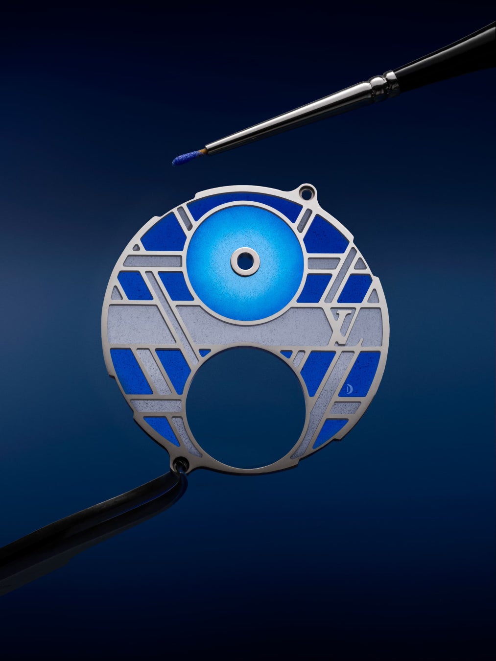 鮮烈な印象を与えるほどの透明度を実現するためには、合計5-6層にわたる半透明のエナメルとそれと同じ回数の焼成を必要とし、ダイアル1つを仕上げるのに約100時間もの作業が費やされます。