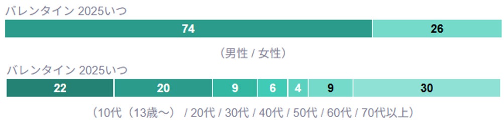 一方で、2025年の1月から5月までの各月の「いつ」と一緒に検索されたキーワードを調べたところ、「バレンタイン 2025 いつ」という検索が2月の7位にランクインしました。「バレンタイン 2025 いつ」と調べた人の属性を見たところ、74%が男性となり、また10代と20代がおよそ半数の42%を占めました。