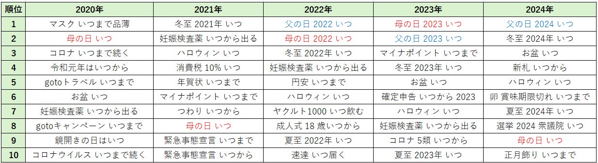 2022年から2024年までは「父の日」と「母の日」の日付を調べる検索が最多。世相を反映するキーワードも