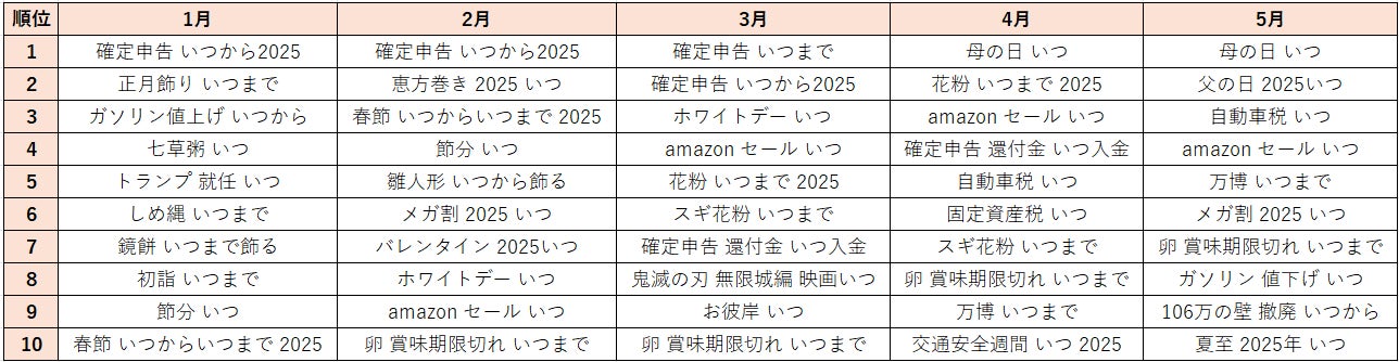 そのほか、月ごとにお正月や節分などの行事に加え、確定申告や花粉などのその時期ならではの「いつ」が検索されています。1月には、ドナルド・トランプ氏が米国大統領に就任したことから「トランプ 就任 いつ」、4月には、大阪・関西万博が開催されていることから「万博 いつまで」、5月には補助金によりガソリン価格が下がったことから「ガソリン 値下げ いつ」などが検索されていました。その時期ならではの関心事が、「いつ」の検索キーワードに現れていることがわかります。