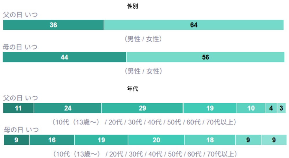 近年多かった「父の日 いつ」と「母の日 いつ」と検索している人の属性を調べたところ、「父の日 いつ」を検索した人は、「母の日 いつ」と検索した人よりも女性の割合が高く、また20代・30代が多くなっていました。