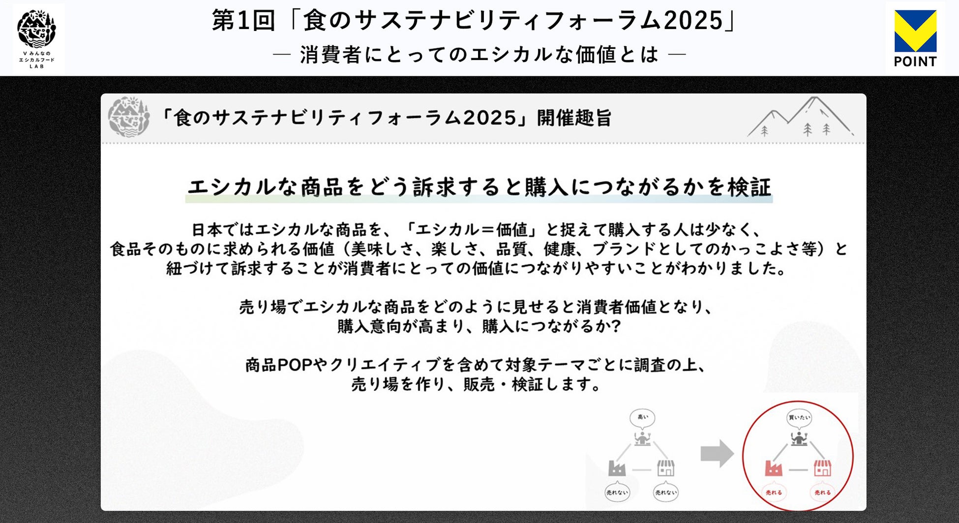 昨年度全4回開催された「食のサステナビリティフォーラム2024」では、業種・業界の垣根を超えたステークホルダーの皆さまにご参加いただき、日本の消費者がエシカルな商品を「社会的価値」だけで選ぶことは少なく、美味しさ・楽しさ・品質・健康・ブランド性といった、食品そのものの価値と結びつけて訴求することで購買意欲を高めることが明らかになりました。この知見を踏まえ、「食のサステナビリティフォーラム2025」では、売り場においてエシカルな商品をどのように提示すれば消費者に価値として受け止められ、購買につながるのかを、商品メッセージを含めて検証しています。