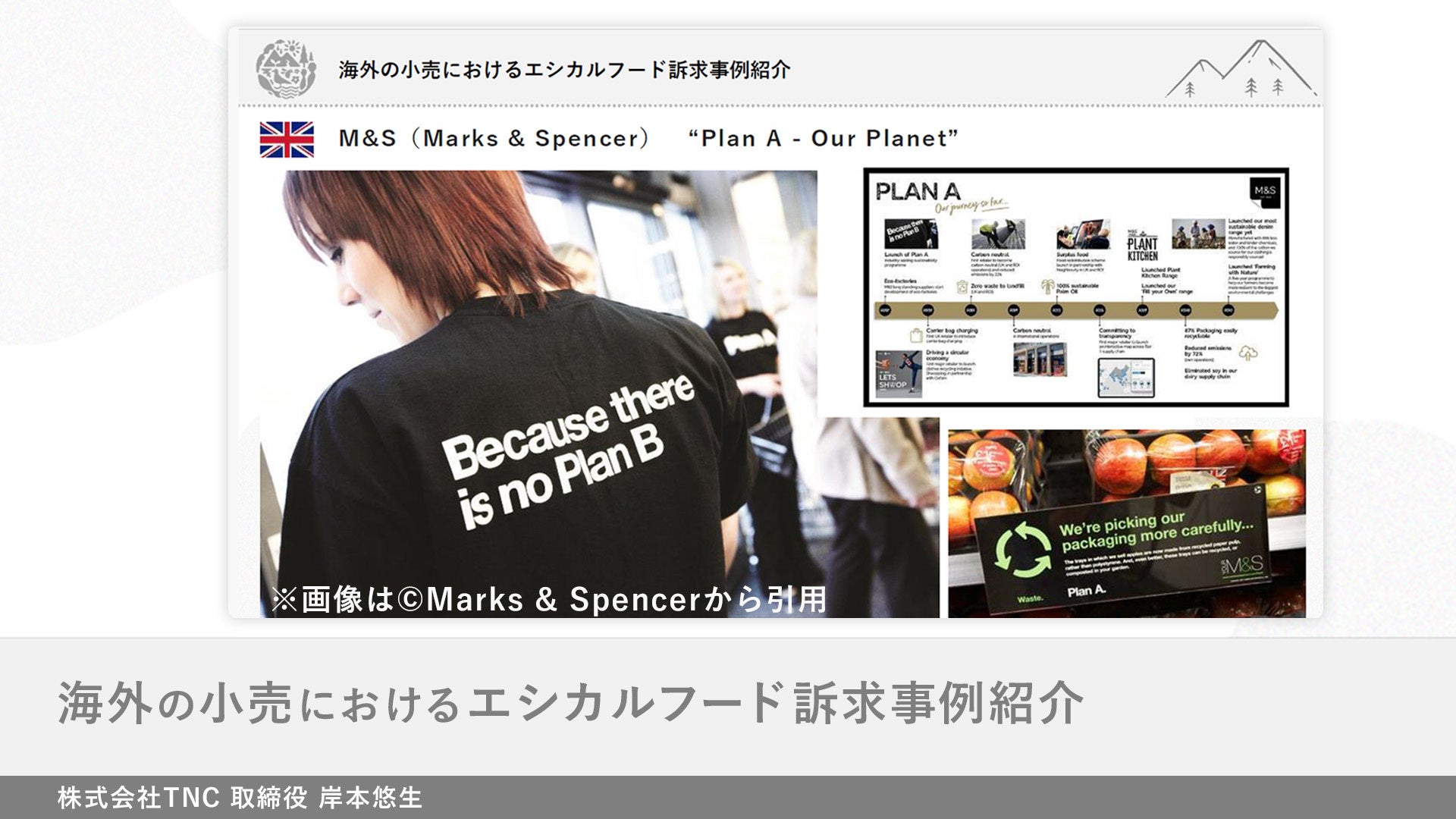 イギリスのアッパー向けスーパーマーケット「Marks & Spencer」では、2007年より「Plan A」という明確な方針を打ち出し2040年に向けたステップを発表、ウェブサイトにて自社の取り組みを発信しています。また「100% British」(地産地消)など方針に基づく品揃えをはじめ「Because There is no Plan B」というキャッチ―なワードとともに、店頭においても明確な1本の柱(Plan A)のもとに分かりやすく集約する形でエシカル訴求を展開しています。