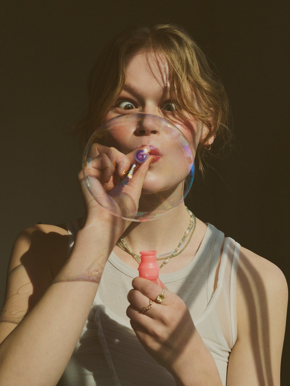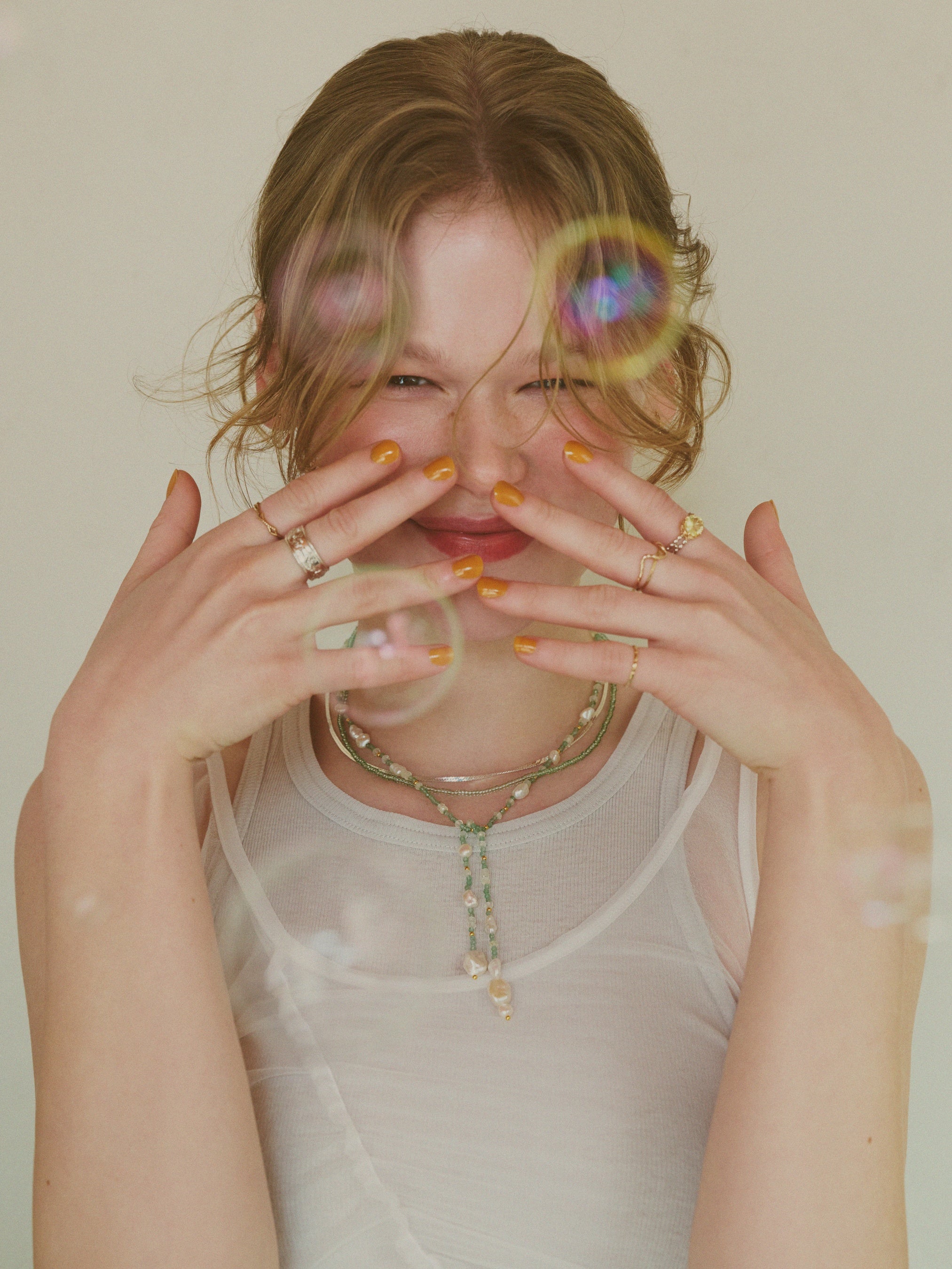 淡水パールと淡い色味の天然石をセレクトしたネックレスやブレスレットは、シャボン玉からインスピレーションをうけ、ひとさじの遊び心を添えたデザインです。Tシャツ×デニムなどシンプルなコーディネートにチェーンネックレスなどとMIXした組み合わせもおすすめ。