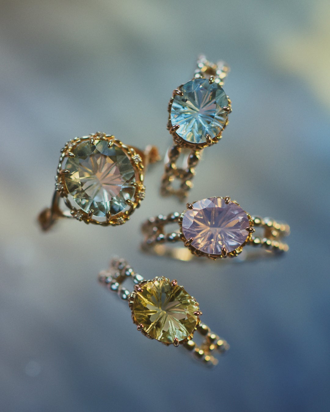 まるで湖の輝きを閉じ込めたような彫り模様のストーンが主役のリング。手元に上品な華やかさをプラスし、異なるカラーリングでミックス感を楽しむのもおすすめ。