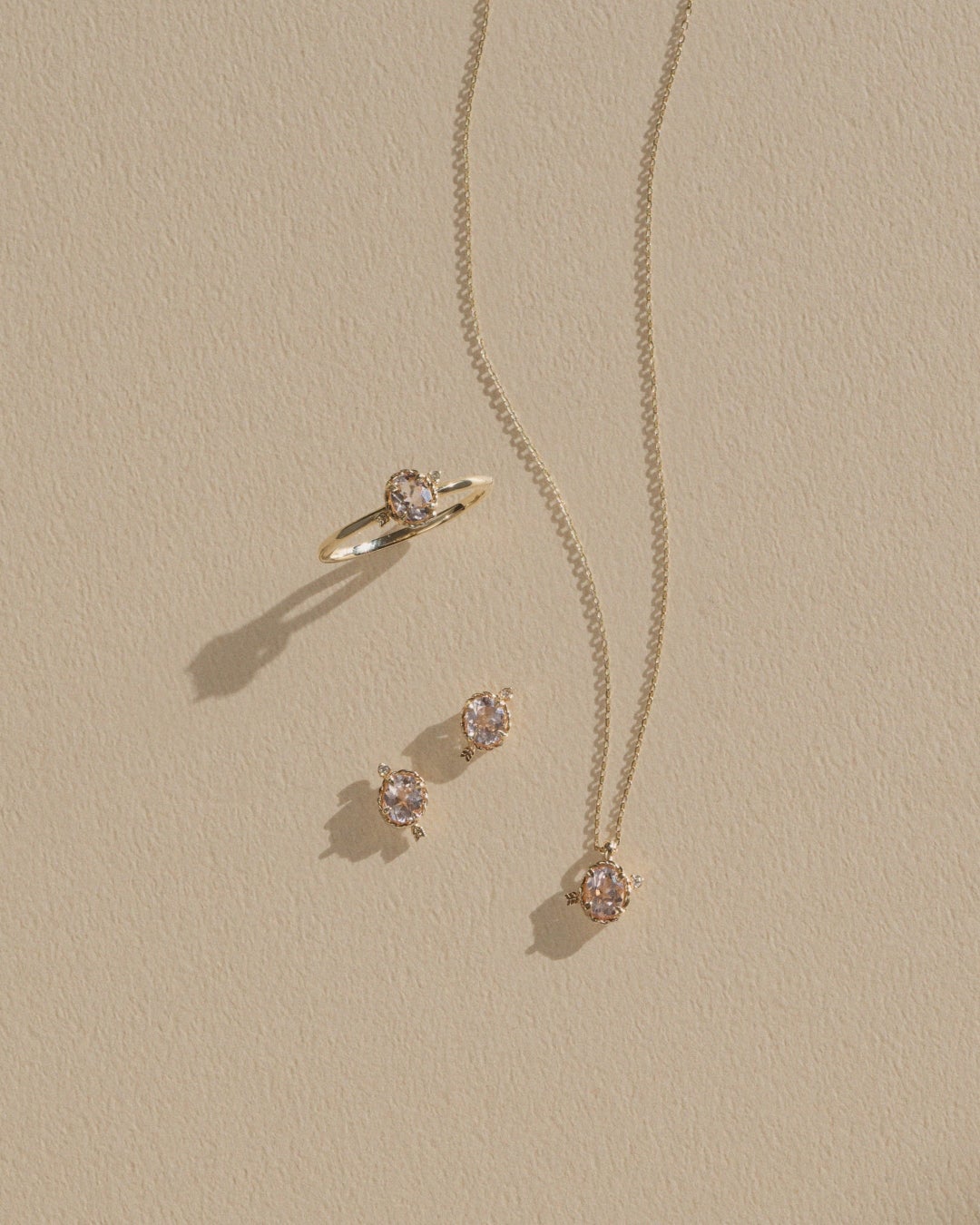 肌なじみの良いモルガナイトを使用した繊細なデザイン。さりげないアローモチーフも特別感があります。重ね着けもしやすく、いつものコーディネートにプラスできるのも魅力です。