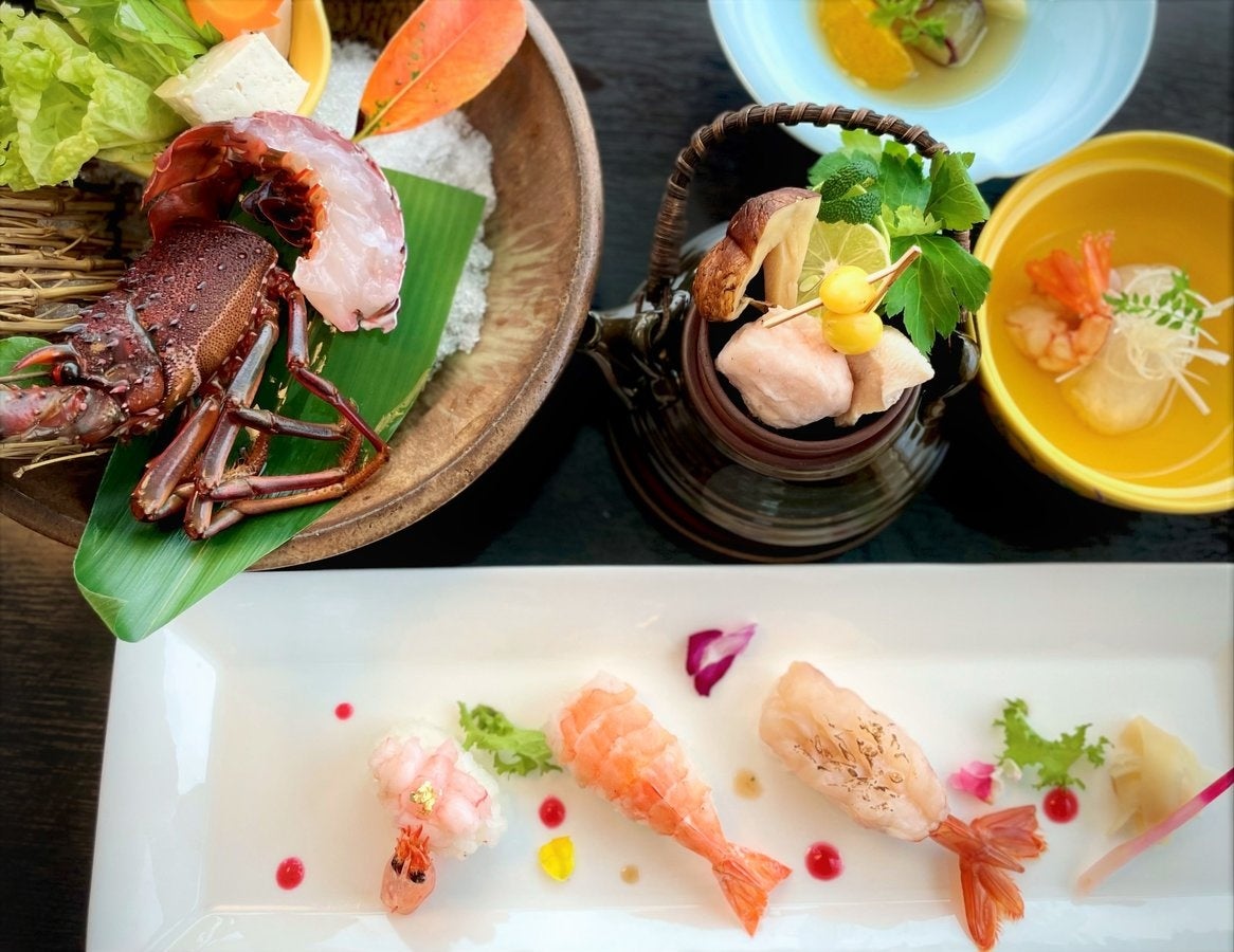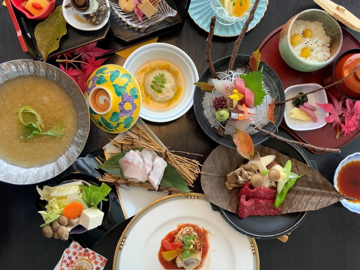 「クエ」を味わい尽くす本宿泊プランでは、身の旨みから食感、出汁まで余すところなく堪能できる多彩なお料理をご用意いたしました。クエ変り造りやクエ香草焼き、クエ竜田揚げなどの様々な調理法でクエの魅力を調理長が最大限に引き出します。中でも「クエ紀州鍋」は、脂がよくのった白身と紀州南高梅と柑橘出汁が織りなすハーモニーが特徴です。また、期間限定秋の味覚を愉しむお料理プラン「紀秋会席」や、伊勢海老をはじめ、牡丹海老、甘海老などを使い、味わいと食感に工夫を凝らした「海老会席」、和歌山県のブランド牛肉「熊野牛」をメインにした特別会席「熊野牛会席」、伊勢海老・鮑・蟹・クエ・熊野牛の5大食材の味覚を愉しむ美食会席「絢爛会席」など豊富なラインナップをご用意しております。