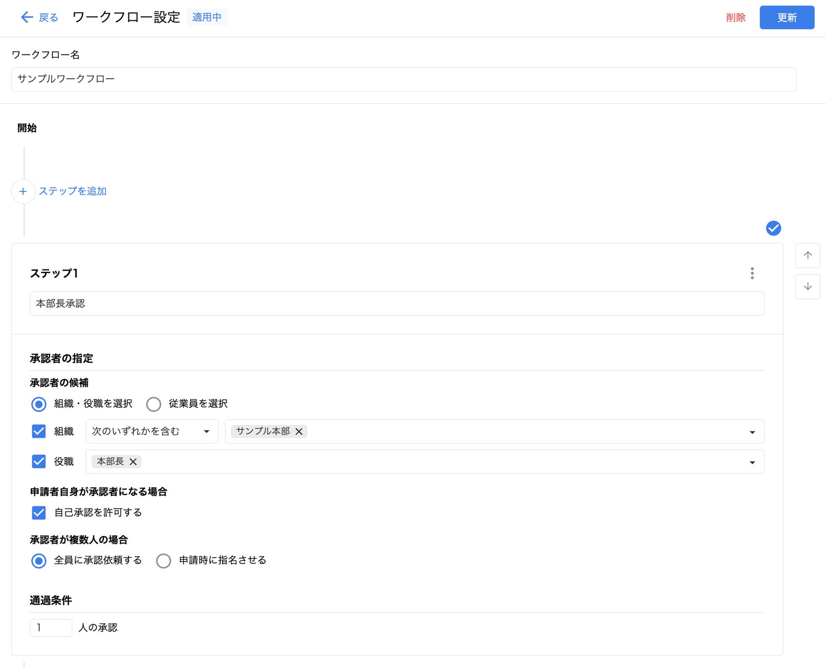 共通マスタに登録した従業員や組織情報から、ワークフロー設定画面から承認者を選択する際に、「特定の組織と役職」「申請者の所属組織と役職」などの組み合わせにより、承認者を指定することが可能です。