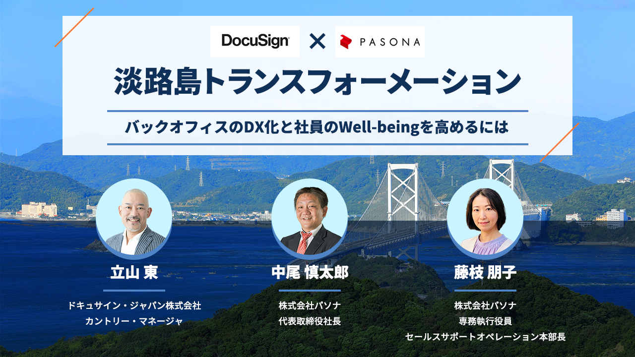 本ウェビナーでは、電子署名サービス最大手のドキュサイン・ジャパン株式会社 立山東氏、パソナの代表取締役社長 中尾慎太郎、淡路島にてバックオフィスからフロントオフィスまで、幅広い業務の DX を推進する専務執行役員 セールスサポート・オペレーション本部長 藤枝朋子が登壇。