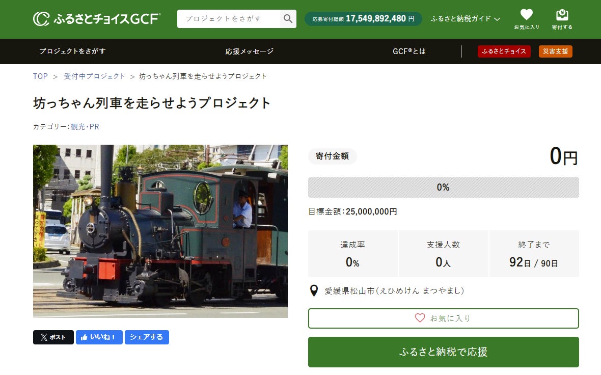 愛媛県松山市とふるさとチョイス、ふるさと納税制度を活用したガバメントクラウドファンディング®で、坊っちゃん列車の運行継続を目的としたプロジェクトを開始