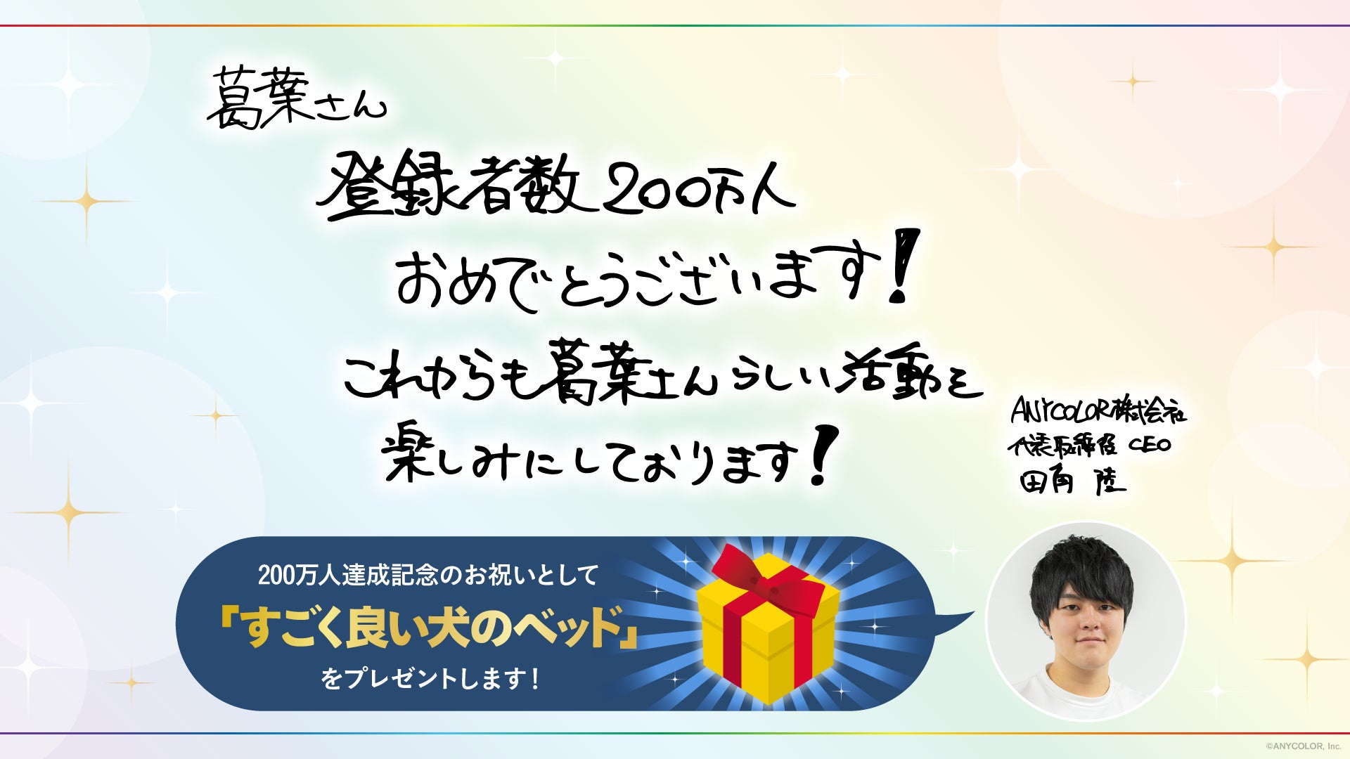 代表取締役 CEOの田角陸より、200万人突破を記念してプレゼントの贈呈を行う事が決定いたしました。葛葉への贈呈品と添えられたメッセージをご紹介いたします。