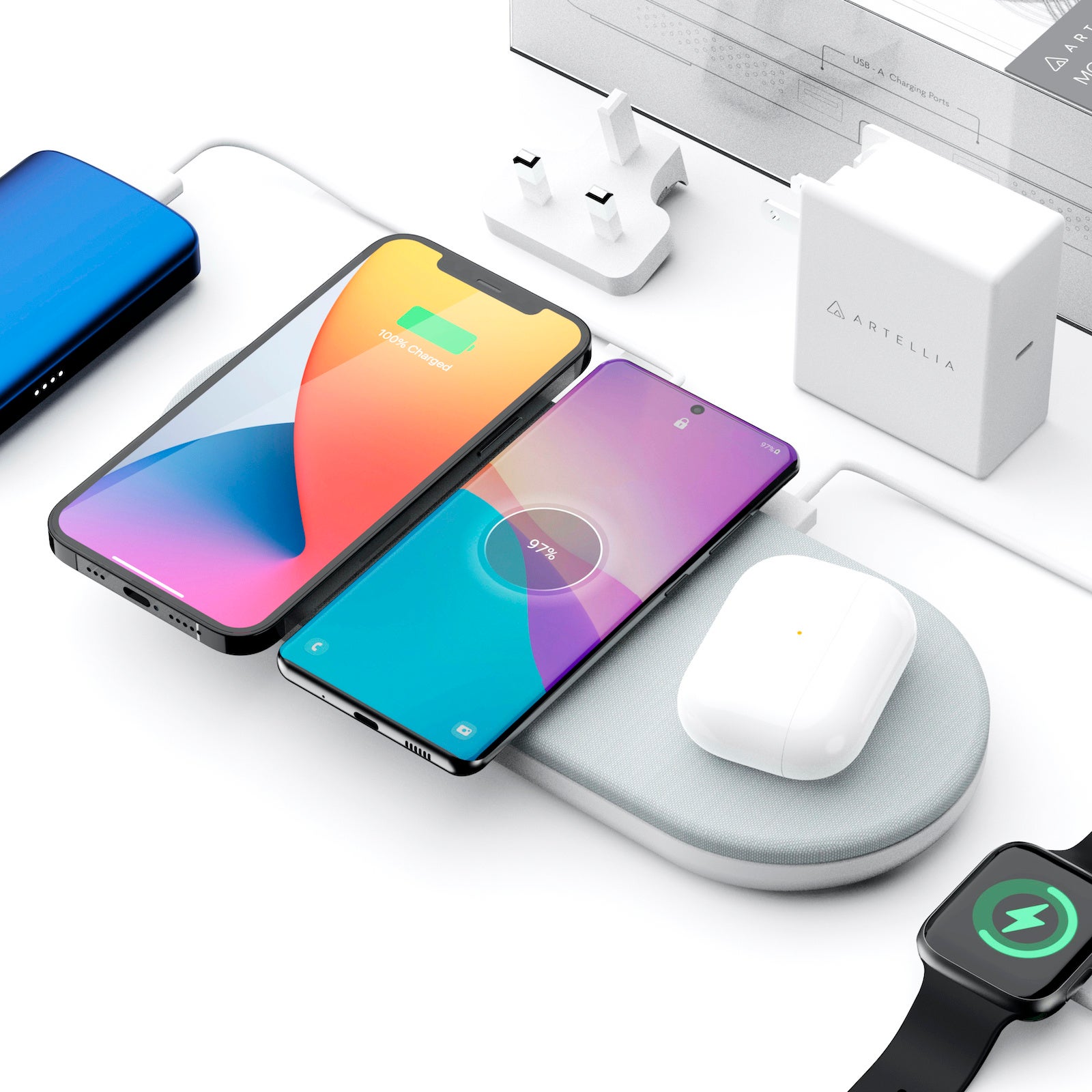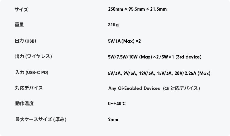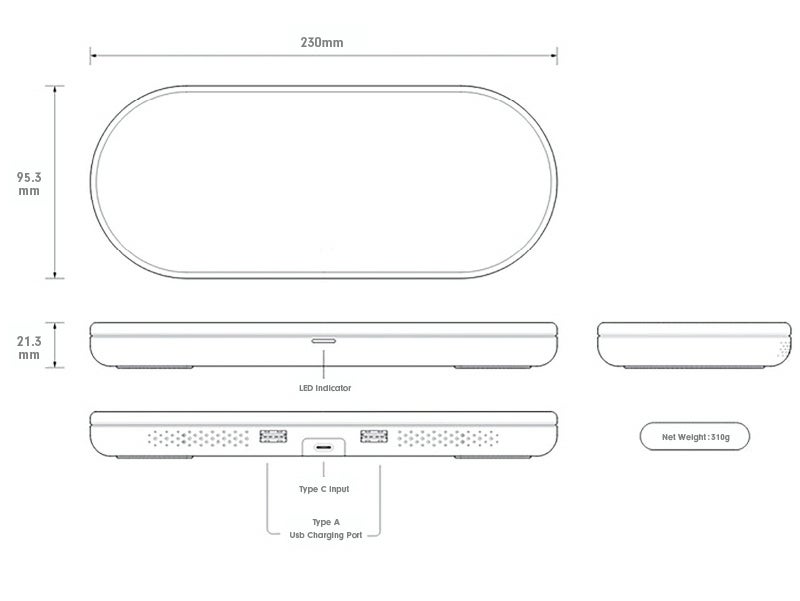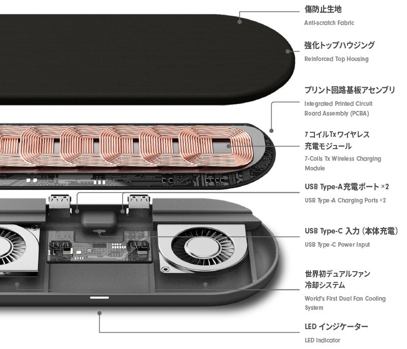 この1台で、ワイヤレス充電、 有線充電、ウェアラブルデバイスの充電、が可能です。高効率の放熱システムを備えていて安全でありながら、その美しいデザインは、手にした人に開放的で自由な使用感をもたらします。