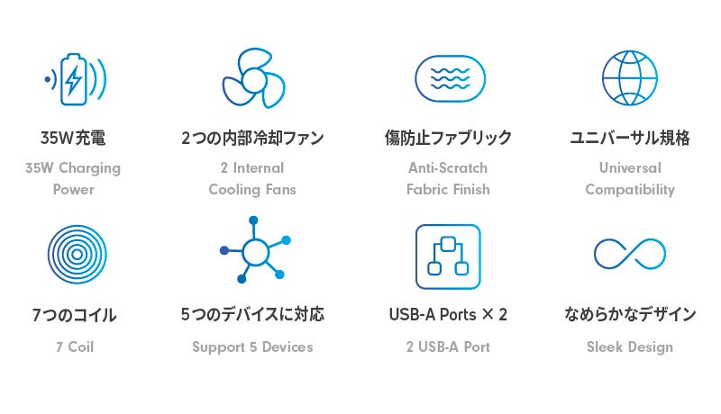 最も速い35W出力のワイヤレス充電器でありながら、最大5台のデバイスを同時に充電できる7コイルテクノロジーを備えた、 革新的なワイヤレス充電ステーションです。