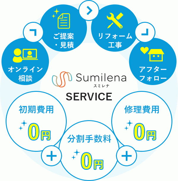 スミレナは東京ガス発のベンチャー企業として誕生したガス機器・水回りが得意なリフォーム会社です。分割手数料0円での分割払いという新しい形でのサービス、お客さまに徹底的に寄り添ったコミュニケーション、施工店との万全の連携によって、お客さまごとのライフスタイルに合わせた「納得・感動のリフォームプラン」を一緒に作り上げ、工事やご利用開始以降のお悩みまでしっかりサポートします。