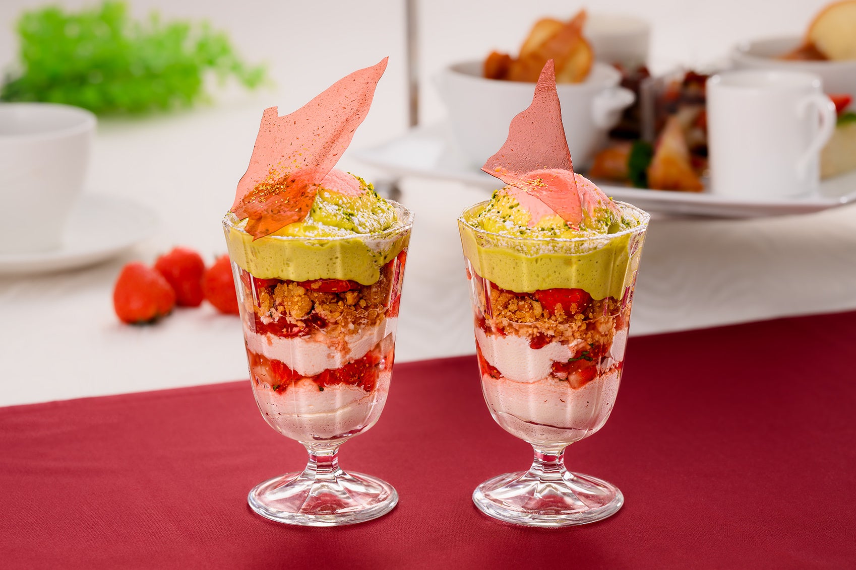 苺を贅沢にあしらい、素材の持ち味を丁寧に重ねた季節のデザートが揃います。パティシエが層のバランスにこだわり、丸の内はちみつやライムの香りを繊細に効かせた「苺尽くしのパフェ」、軽やかなパイ生地とプラリネヘーゼルナッツの奥行きある風味を生かした「苺のミルフィーユ」、焼きメレンゲの食感と柚子クリームの爽やかさを組み合わせた「苺のヴァシュラン」など、苺の華やかな魅力を引き立てるラインナップです。ティータイムをより豊かに彩る、洗練されたひと皿をご堪能ください。