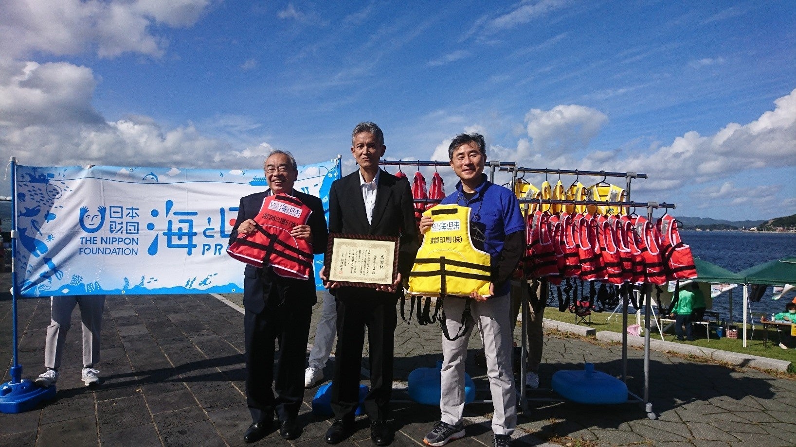子ども達に安全にマリンスポーツを楽しんでもらおうと、松江市の公園にライフジャケットステーションが設置され、秋晴れの宍道湖岸でライフジャケットの寄贈式が行われました。渡部印刷株式会社の内部浩志社長と海と日本プロジェクトinしまね実行委員会の松崎貴実行委員長から、水辺の利活用事業を行うミズベリング松江協議会の松浦俊彦会長に、ライフジャケットが手渡されました。