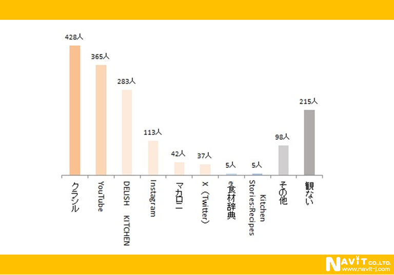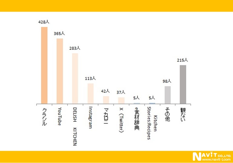 見るサイトは、「クラシル」が428人でトップ。次いで多いのは「YouTube」の365人でした。