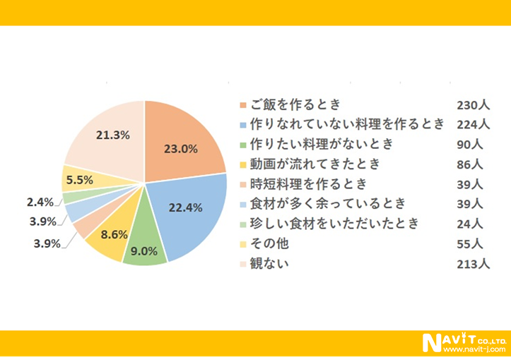 レシピ動画を見るのは「ご飯を作るとき」230人がトップで、2番目に多い回答は「作りなれていない料理を作るとき」224人でした。見て楽しむだけでなく、レシピ動画を見ながら料理を作る主婦が多いということでしょう。