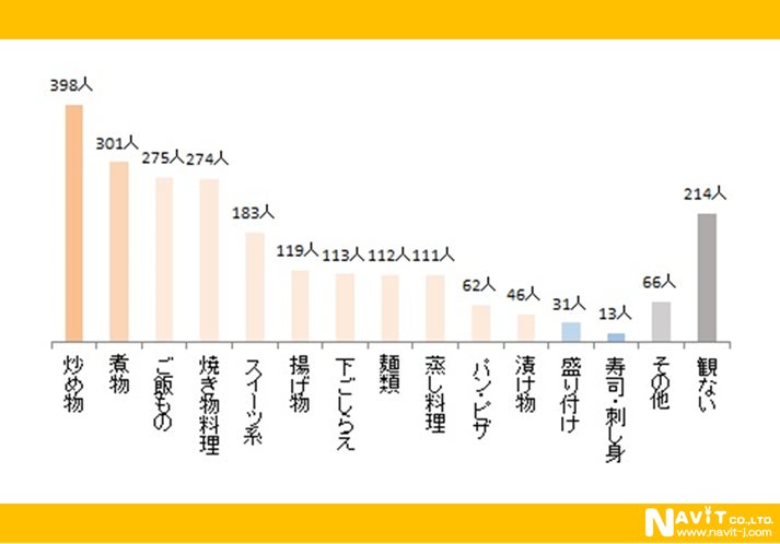 よく見るジャンルは「炒め物」が最も多くて、398人。「煮物」301人が2位、「ご飯もの」275人が3位と続きます。ジャンルの内容はかなり広範囲にわたっています。