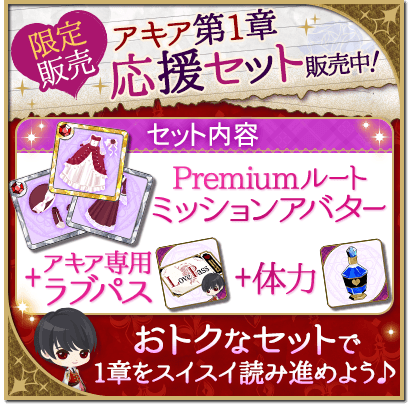 アキア本編ストーリー第1章のミッションアバターとアキア専用ラブパス、体力が入った応援セットを販売中です。お得にアイテムを手に入れてアキアのストーリーをどんどん読み進めてください♪