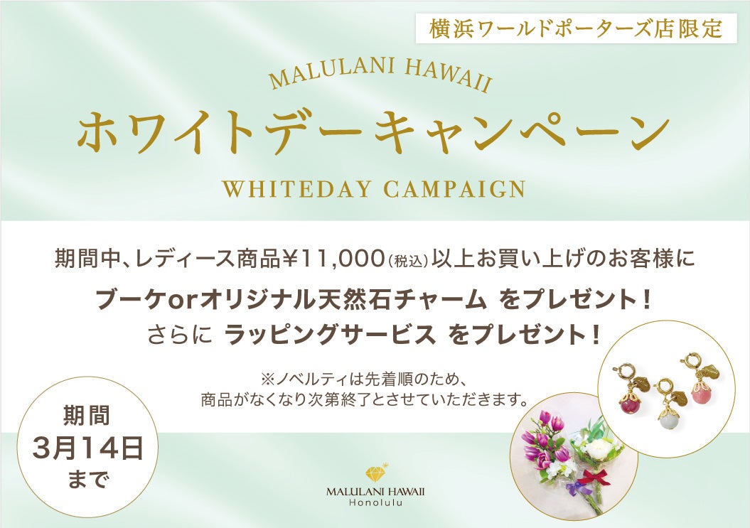 大切なあの人へ ホワイトデーキャンペーン【ブーケorオリジナル天然石チャーム プレゼント】 マルラニハワイ 横浜ワールドポーターズ店で開始しました