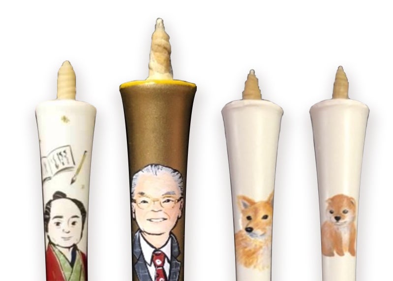 京都市の指定する74品目の伝統産業の1つに認定されている「和蝋燭」。植物性の和蝋燭は、一般的に石油を使用する洋ローソクと違い、油煙が極端に少なく、風に対しても消えにくく、また芯が中空なので風がなくても炎が揺らぐ為、神秘的で心安らぐ炎を演出します。そして灯りとしてだけでなく、お供え・おつかいものとしての意味合いもあるのが絵蝋燭です。お花の代わりにお供えする絵蝋燭は、火を灯すことなく飾って楽しむことができます。